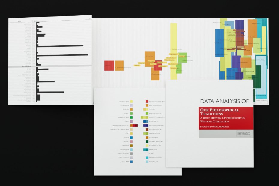 연대표에 있는 직사각형의 면적은 각 철학자가 책의 지면에 할애되는 양(Quantity)을 보여준다. 아리스토텔레스가 33페이지로 가장 많은 지면을 차지한다. 그리고 105명의 철학자를 학파별로 구분하기 위해서 41개의 색상 팔레트를 사용하였다.