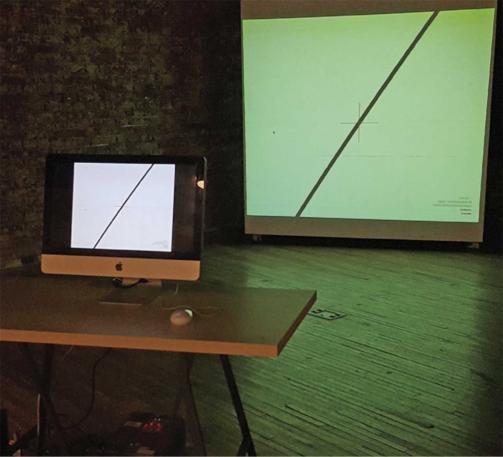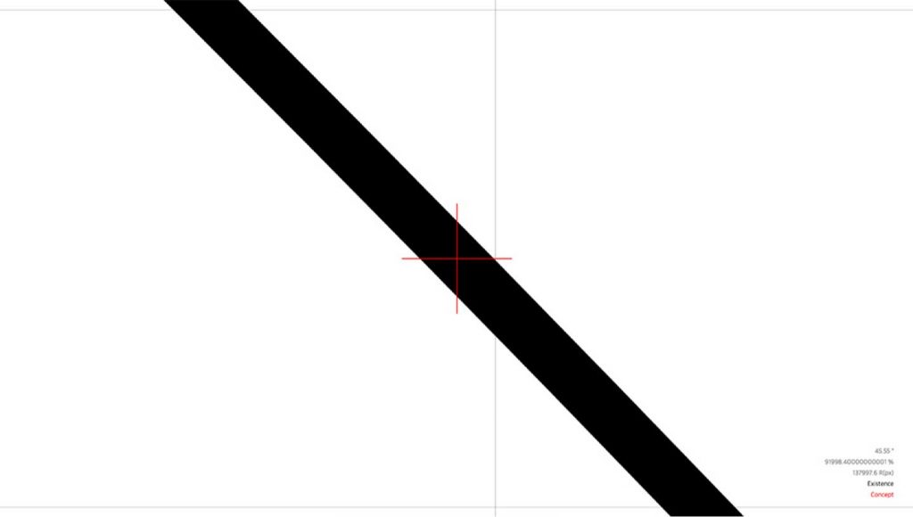 <원의 이데아>에서 가운데 빨간색 십자선은 우리의 관념이 검은색 원(스크린에 표현된 실재)을 따라가고 있다. 적어도 관람객이 원을 확대해서 관념과 실재가 일치하지 않다고 인지하는 지점을 만나기 전까지는 원(관념)은 원(실재)이다. 원을 확대하면 곡선이 점점 직선으로 펼쳐지는 것처럼 보인다. 프로세싱에 의해서 연산(신호 처리)되고 확대될 수 있는 특정 지점(파이값 3.141593으로 연산)을 지나면 관념이 그리던 원은 스크린에 표현되는 원과 이탈한다. 사실 연산의 특성상 원을 따라가는 십자선의 X축과 Y축은 각각 Cos(코사인)과 Sin(사인)의 비율을 사용하기 때문에 일정한 리듬을 타며 이탈하게 된다. 그렇게 보여지는 직선은 묘한 느낌을 주며 요동치는데 그 느낌은 아마도 정확히 구해질 수 없는 파이값 소수점 아래의 무한성과 관련이 있을 것이다.