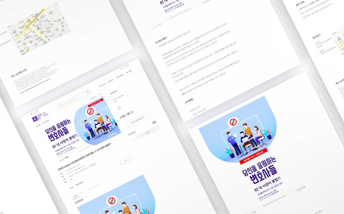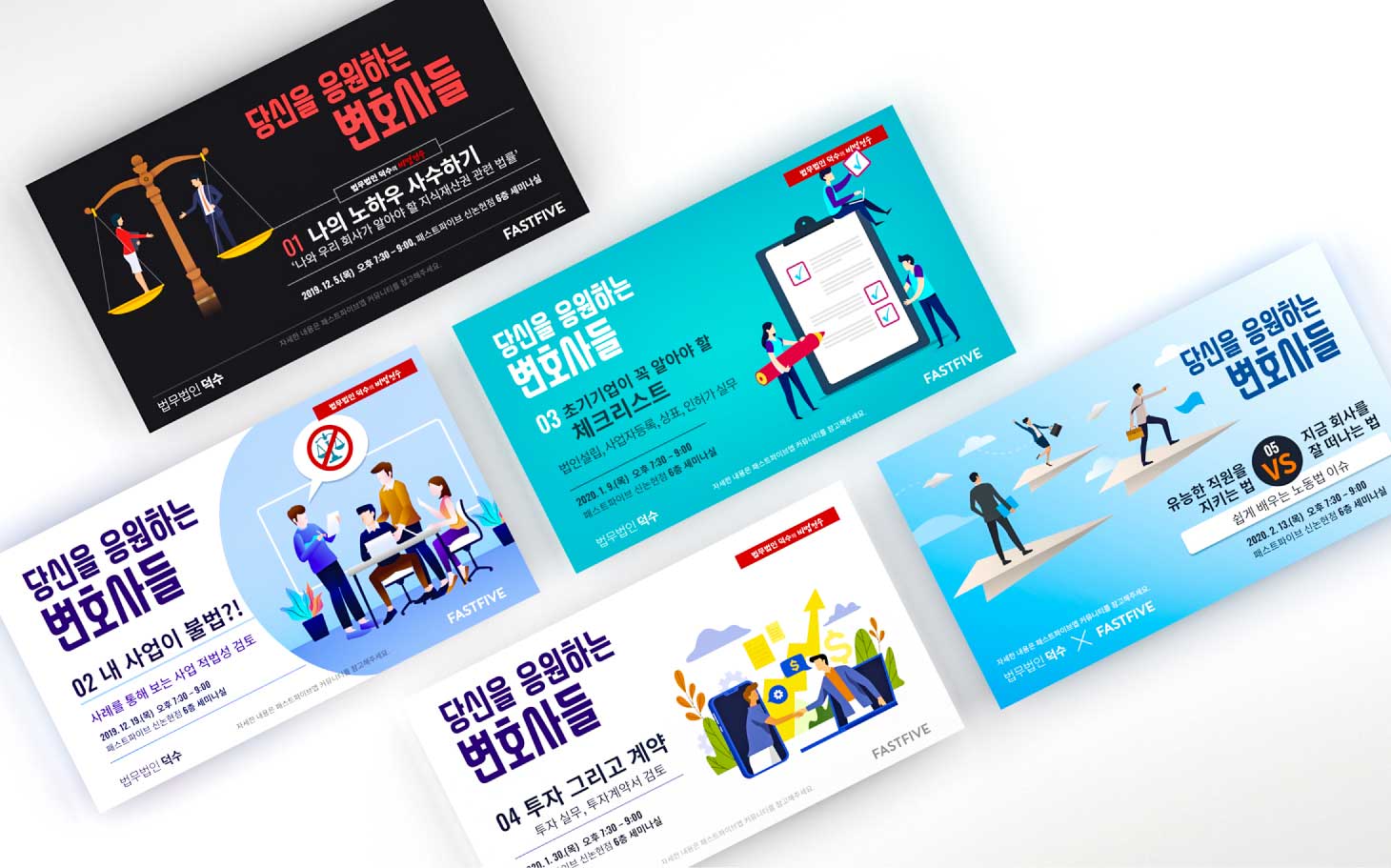 "패스트파이브의 강연 플랫폼에 적합한 포스터 사이즈. 그리고 1920 가로 해상도에서 가장 잘 보이는 요소별 사이즈 설정. 다소 딱딱하게 느껴질 수 있는 법률강의의 첫인상을 완화할 수 있을만한 일러스트레이션을 사용하여 제작하였다."