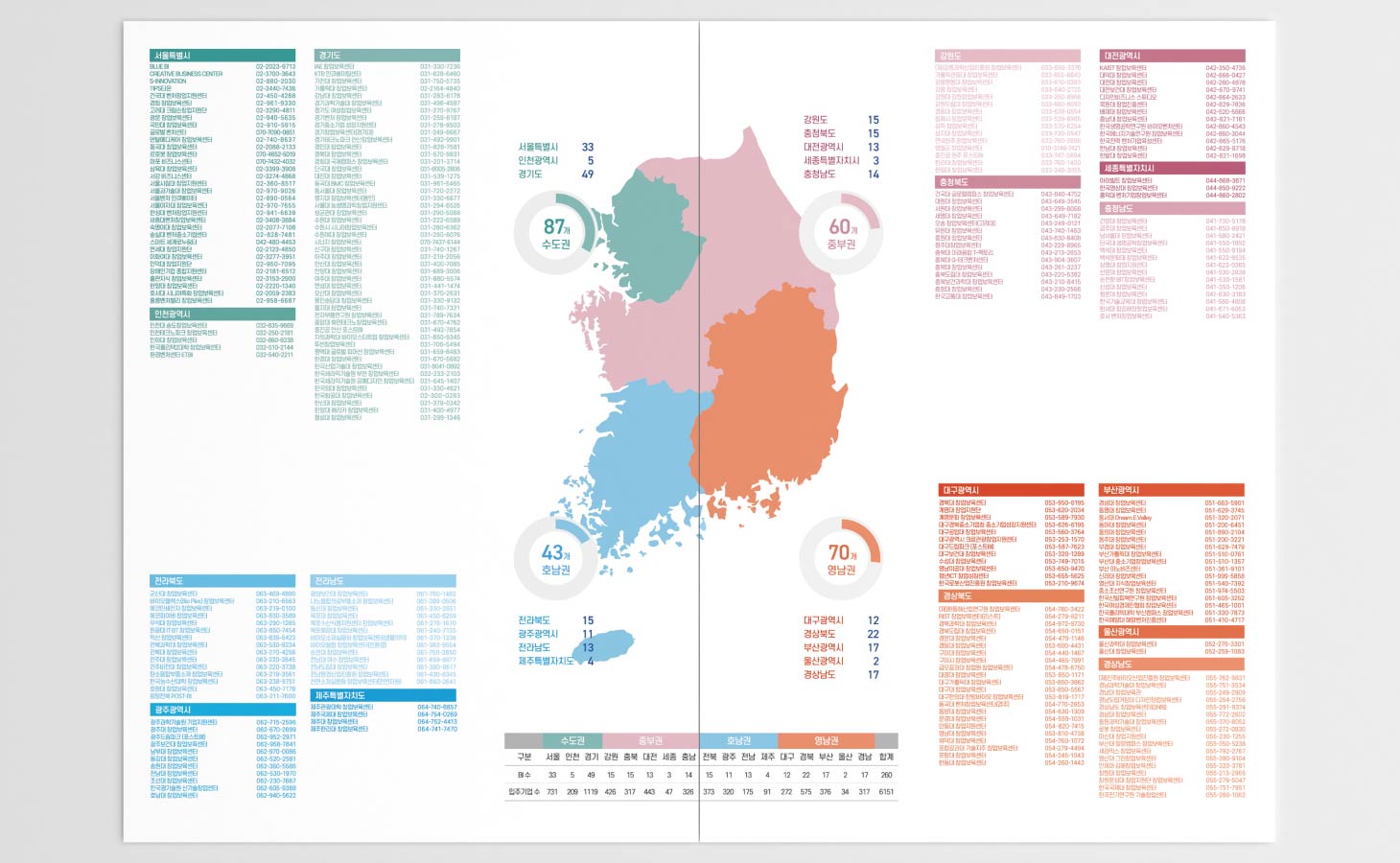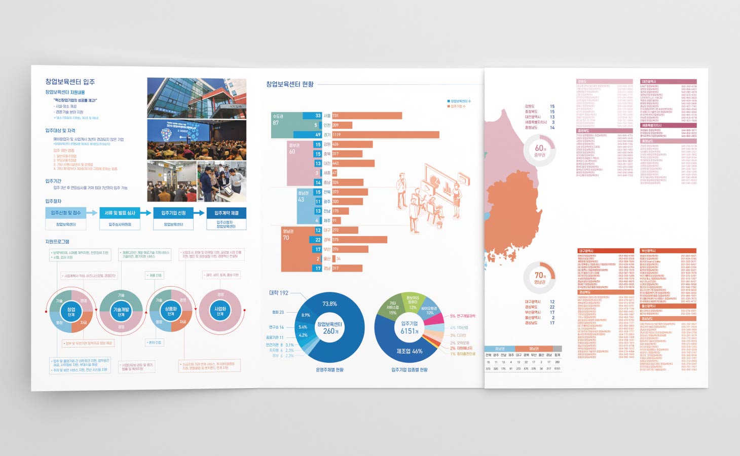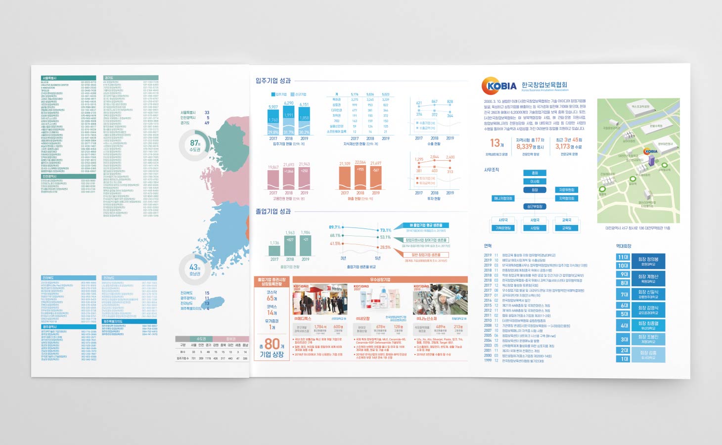 한국창업보육협회는 전국 260여개의 창업보육센터를 지휘하는 곳으로, 보육센터는 스타트업이 사업을 시작하기 좋은 장소이다. 리플렛은 협회를 설명하고 홍보하는 용도이지만 협회가 이뤄온 성과에 대한 보고서이기도 하다. 따라서 많은 내용을 일목요연하게 정리하는 것도 중요하고, 각종 통계 데이터를 적확하게 표현하는 것이 핵심이다.