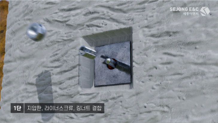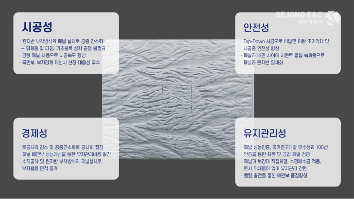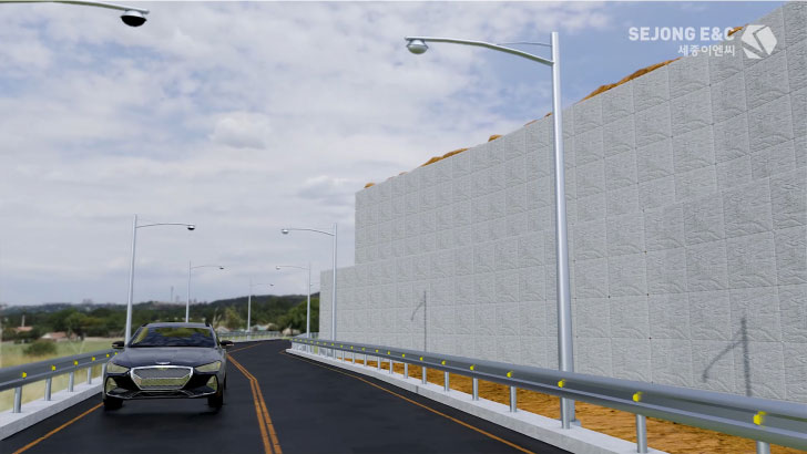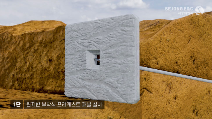 세종이엔씨의 신기술/신공법 중 하나인 GAP공법의 시공장면을 3D공간에 그대로 재현하였다. 독특한 문양의 프리캐스트 패널은 그 중요성 때문에 실물 사진의 명암차이의 깊이(Depth)를 보정, 로드한 모델링 작업으로 좀 더 사실적으로 표현하였다.