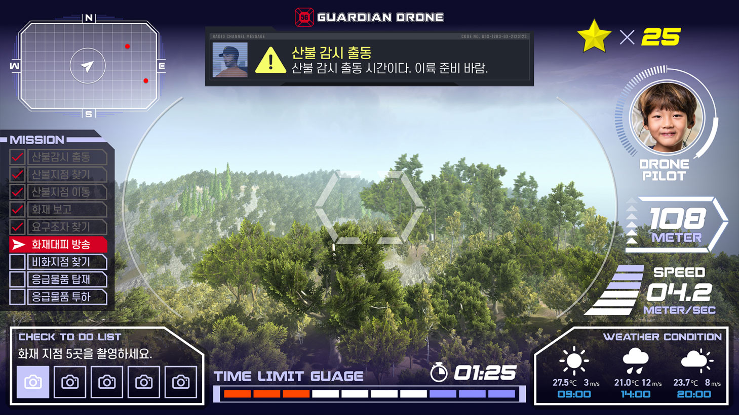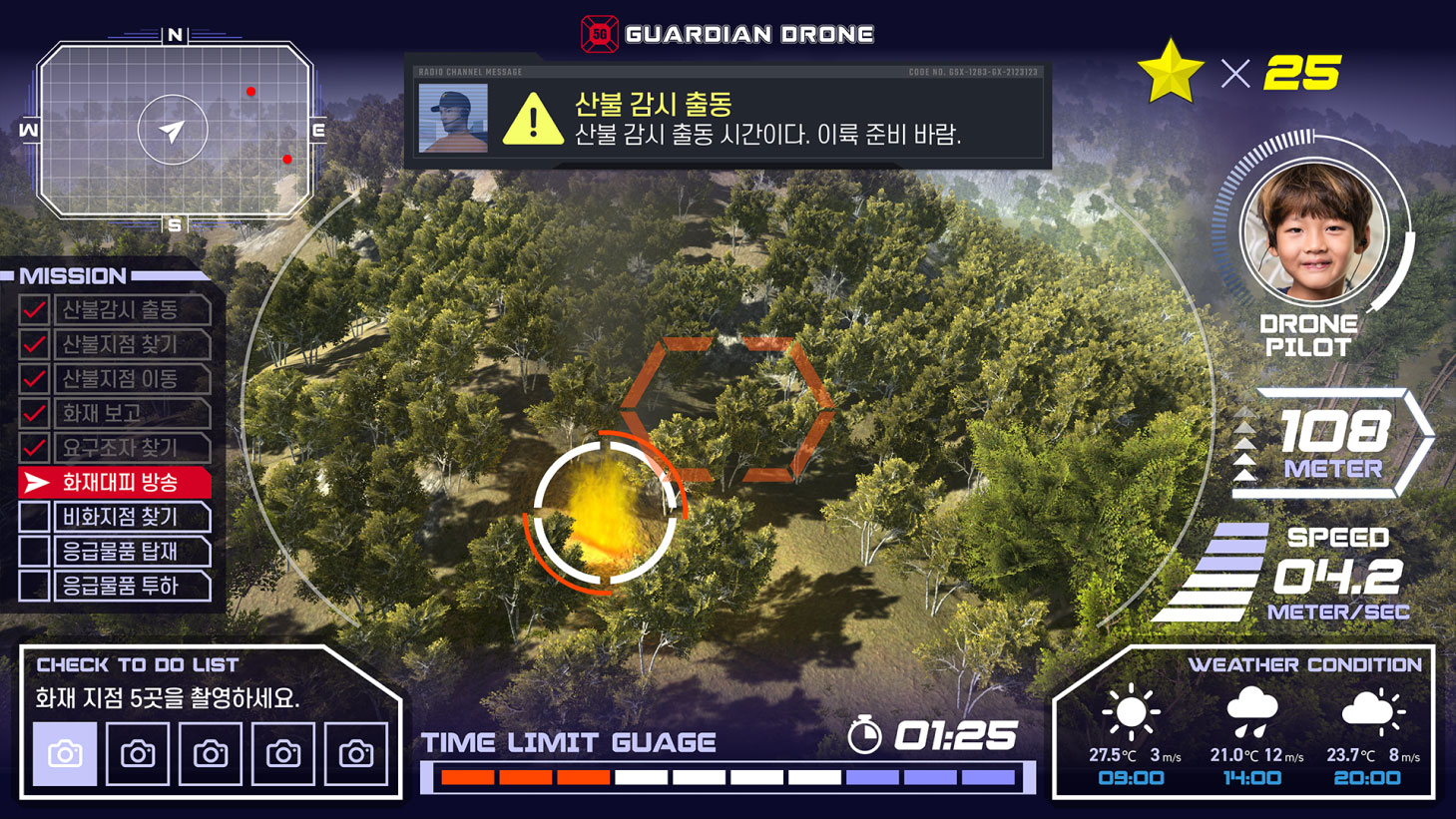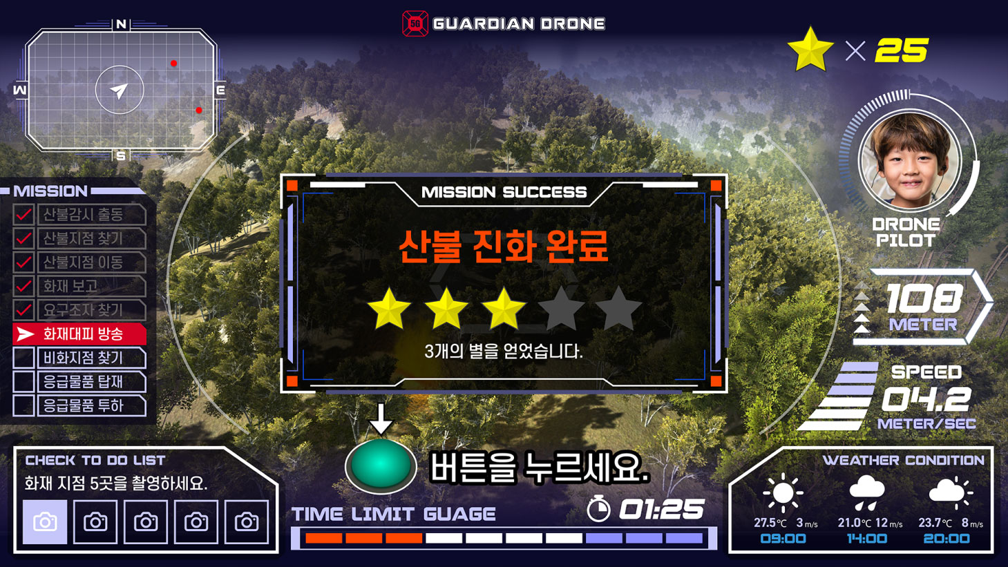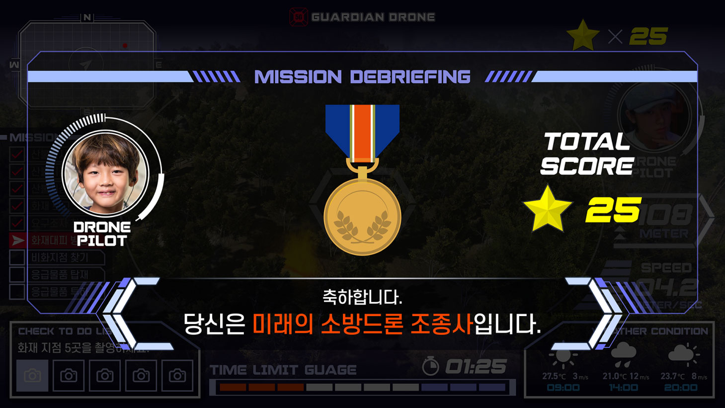 (주)코어센스는 태백에 위치한 365세이프타운에 설치될 체험형 컨텐츠인 산불진화드론 조종체험 게임의 GUI 제작을 의뢰하였습니다. 유초등 연령층을 대상으로 하는 컨텐츠의 목적에 맞게 디자인 컨셉을 설정하였으며 오브젝트의 인터렉션과 장면 전환마다 애니메이션을 구현하였습니다.