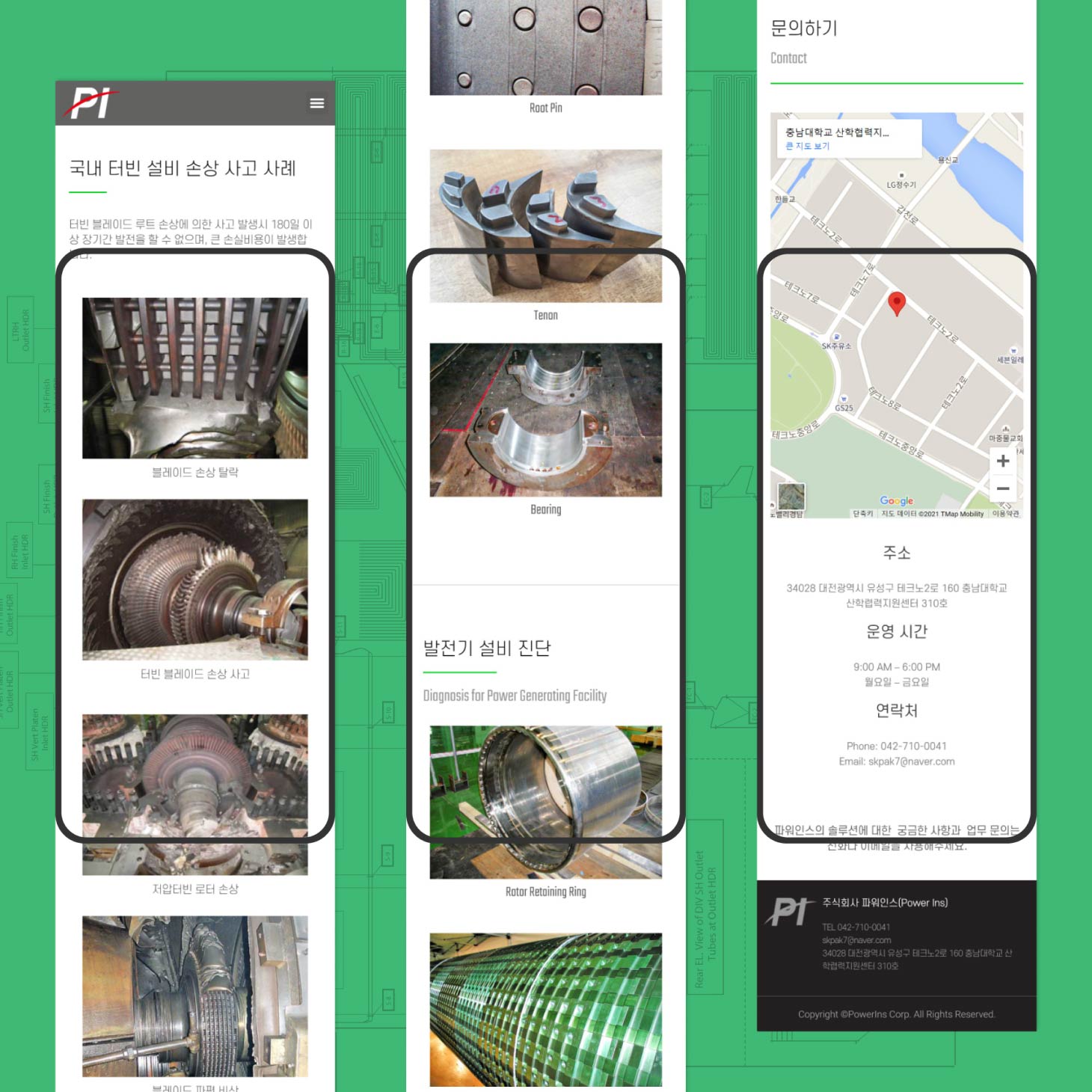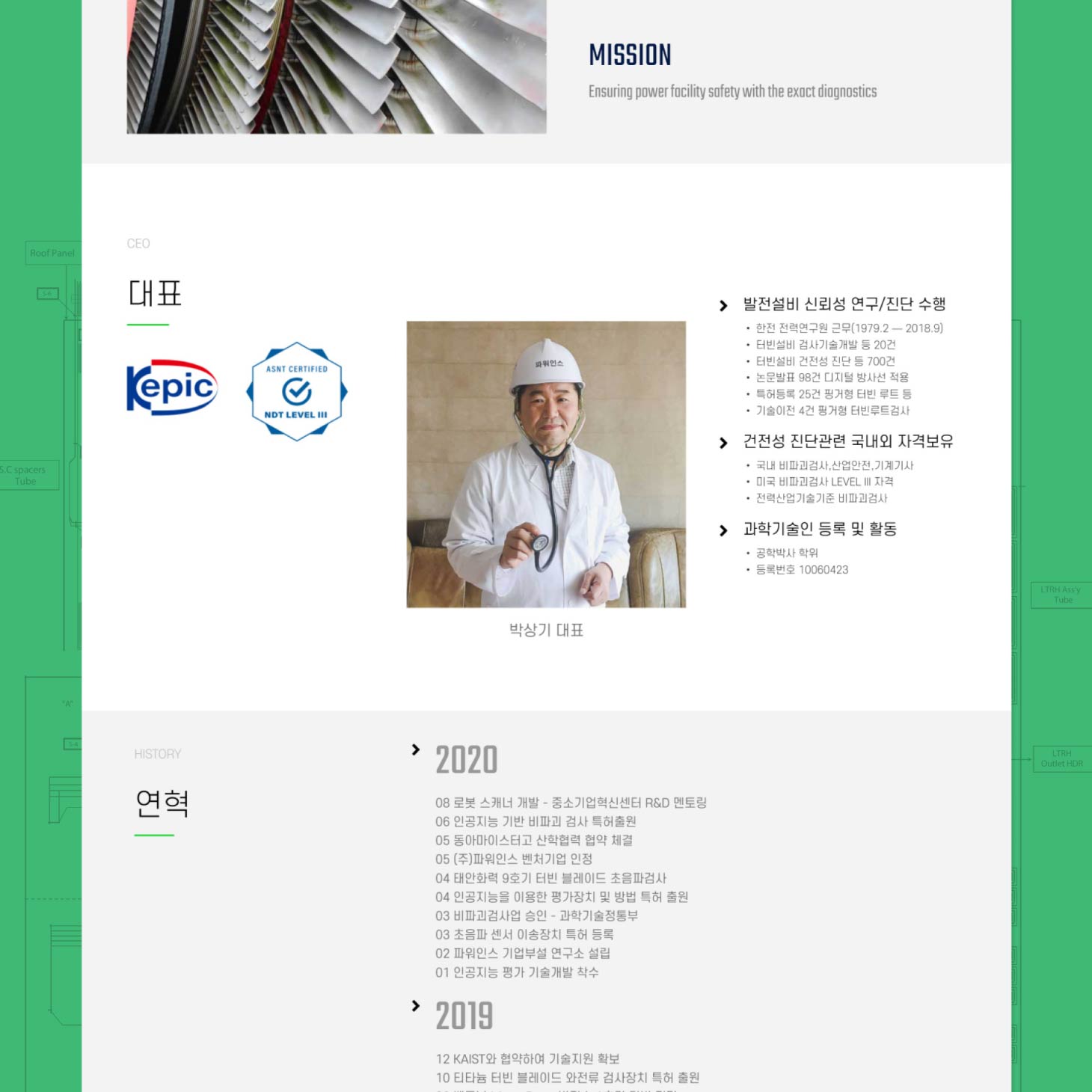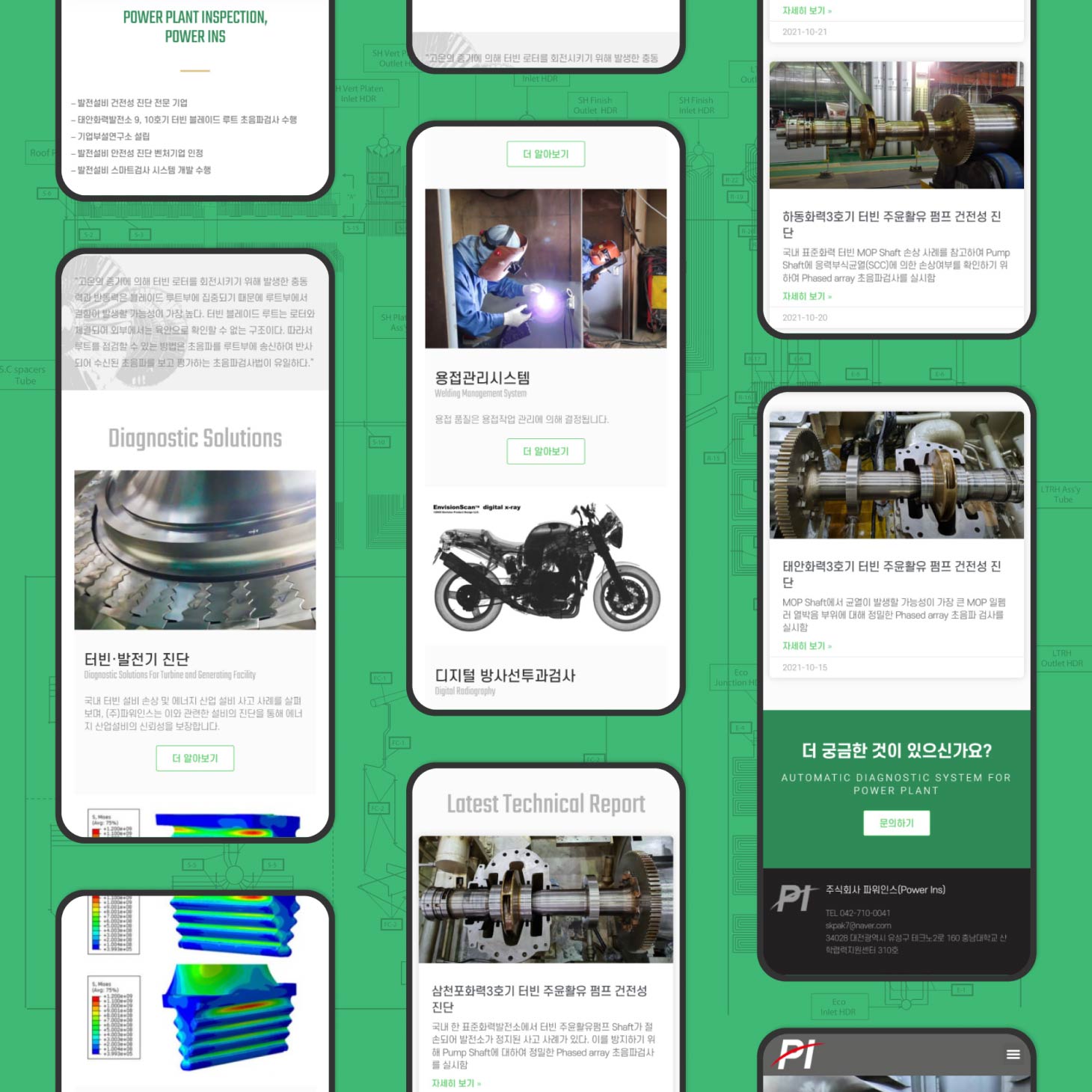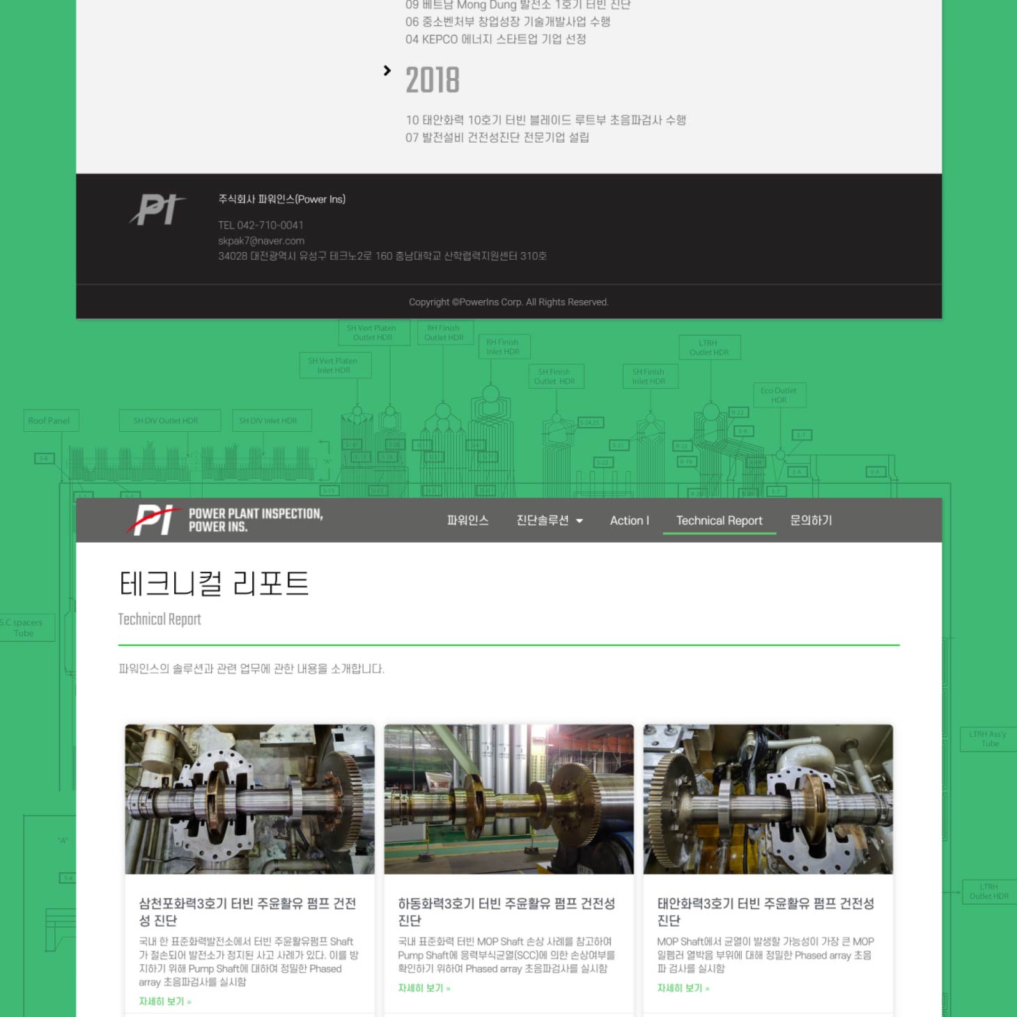 (주)파워인스는 발전소와 같은 에너지 설비의 안전성을 진단하는 기업입니다. 발전소 터빈의 약간의 오차도 허용하지 않는 정밀성 진단이 중요합니다. 딱딱하고 차갑지만 전문성이 느껴지도록 단색과 사진과 진단 자료를 중심으로 디자인과 퍼블리싱을 하였습니다.