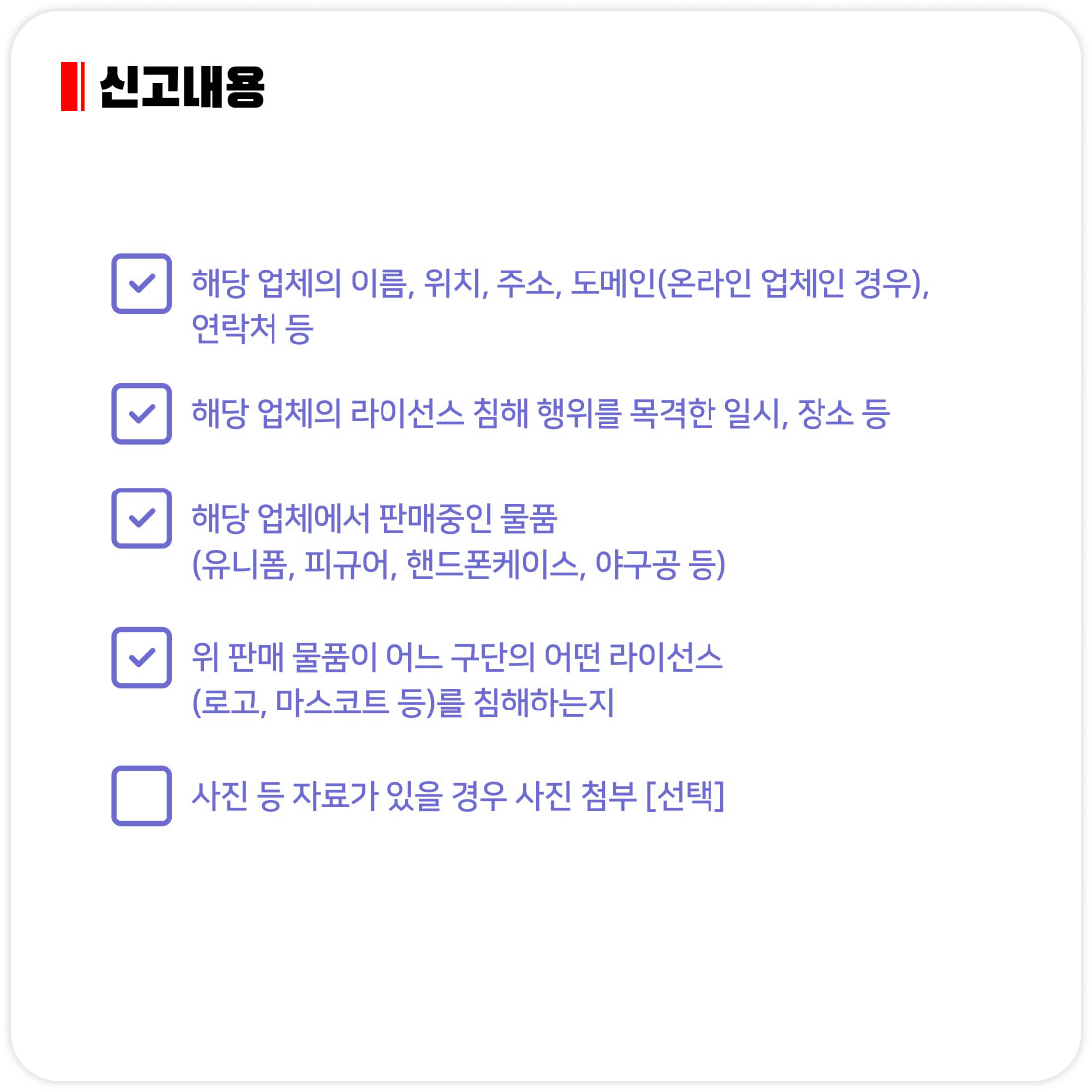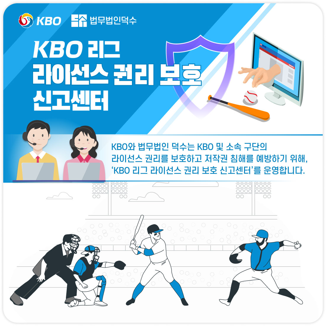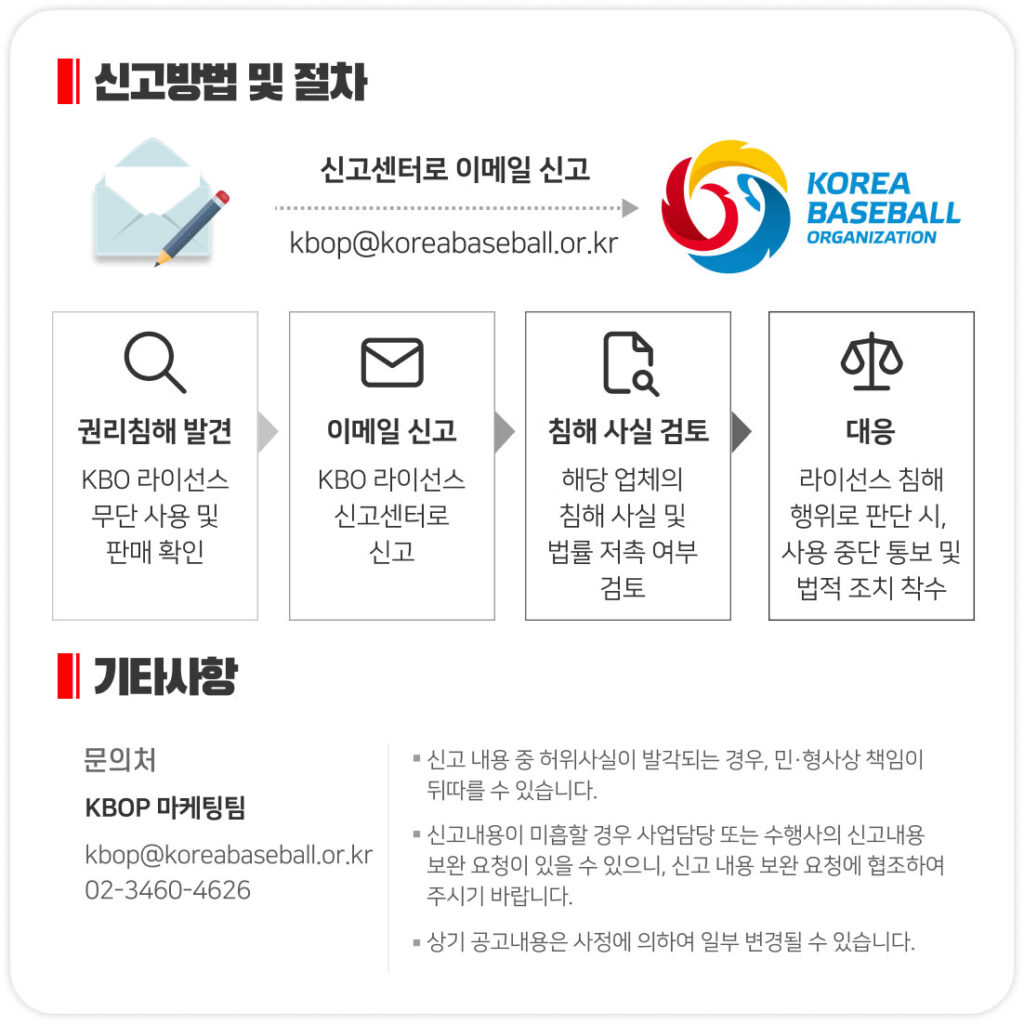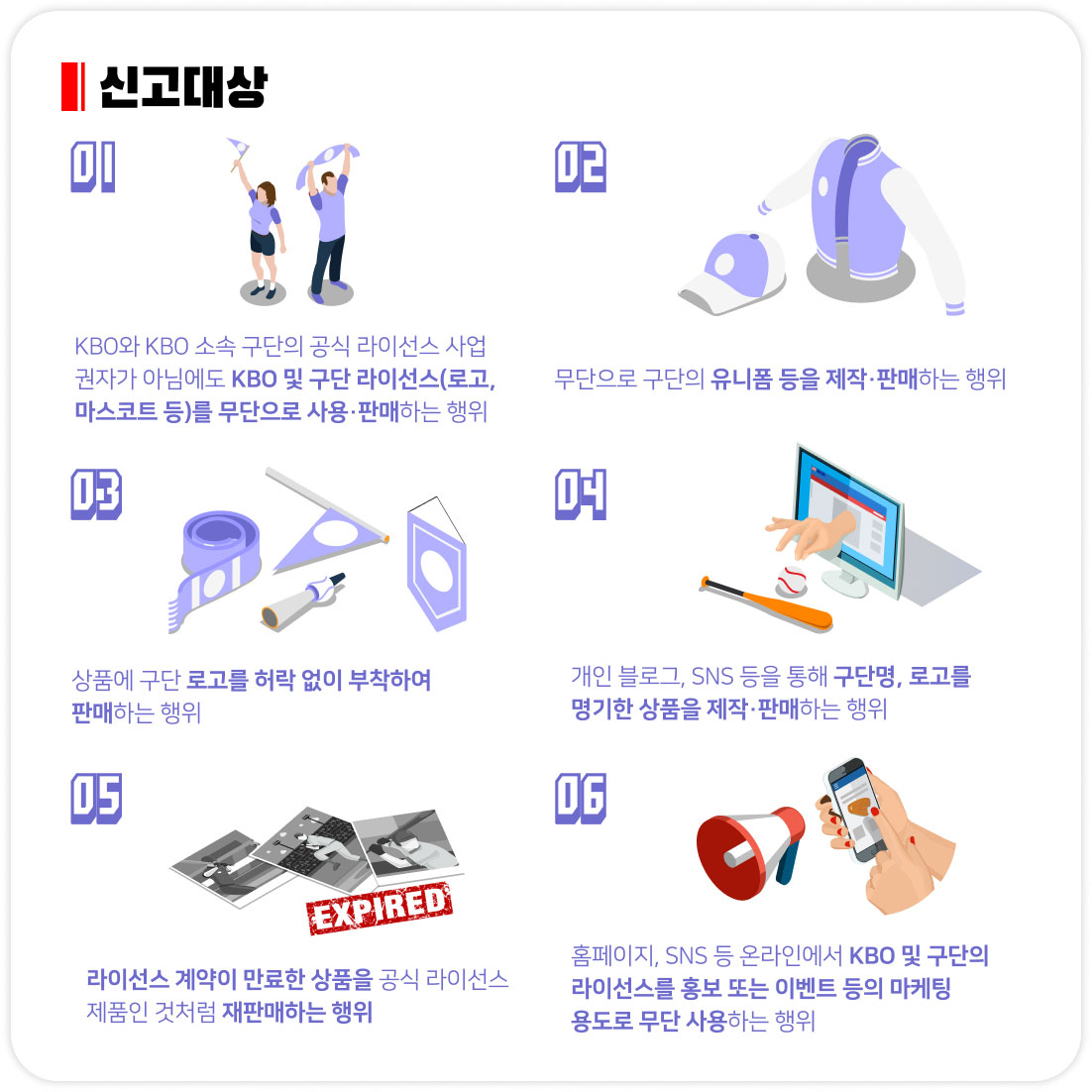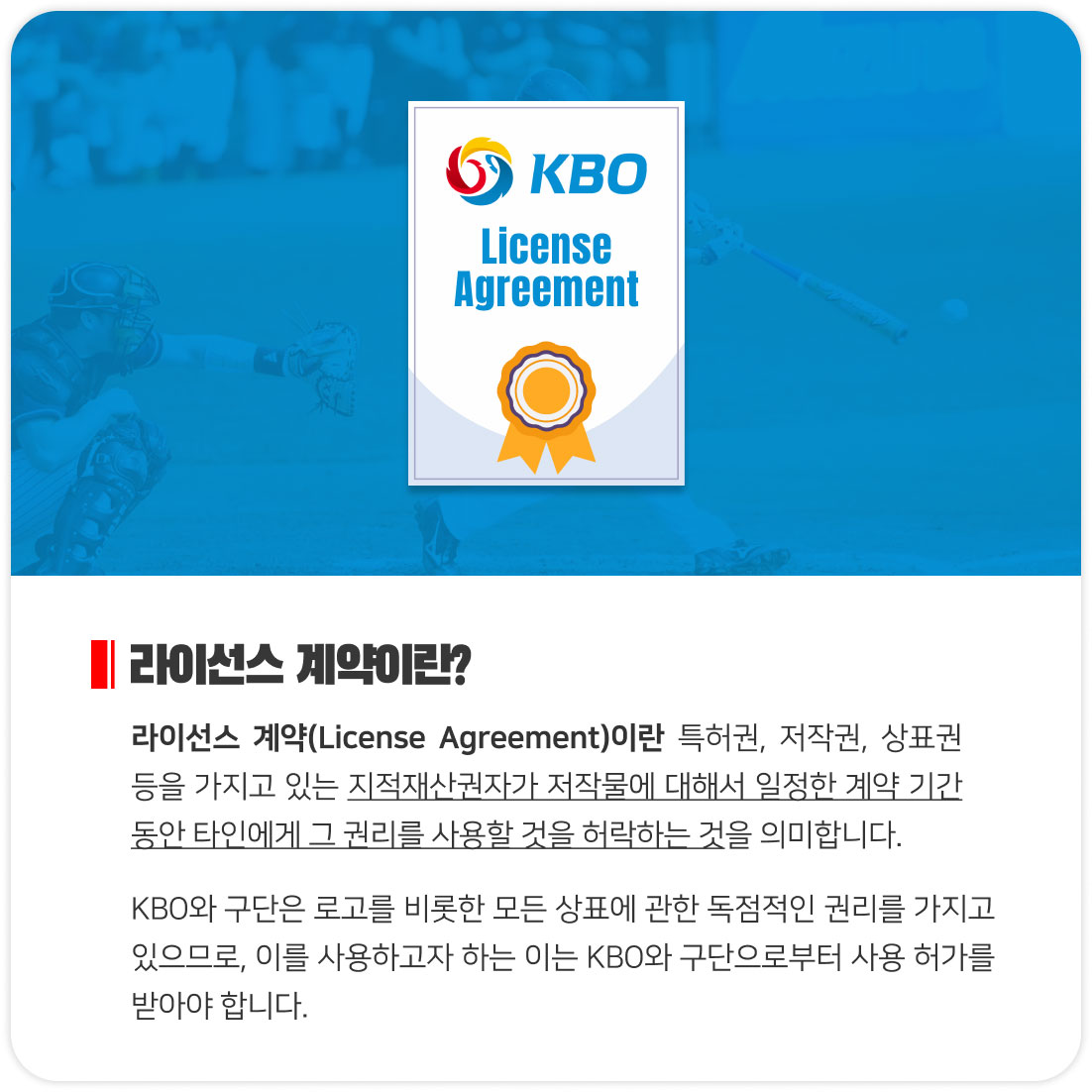 KBO는 구단의 라이선스 권리 보호 및 저작권 침해 예방을 위한 캠페인을 진행하고 있습니다. 한국 야구 구단의 로고나 선수의 이미지를 무단으로 도용하여 이를 사적인 이익에 활용하는 상품이 많이 출시되어 있습니다. 지적 재산권 보호를 위한 캠페인의 홍보 수단으로 SNS 및 홈페이지에 활용할 안내 이미지를 제작하였습니다.
