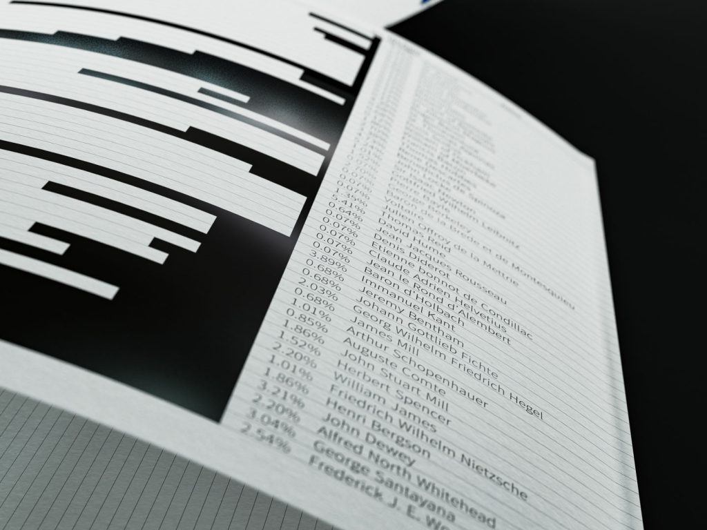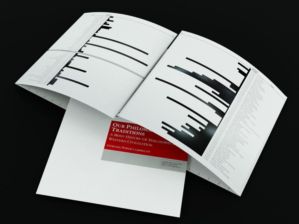 “연대표에 있는 직사각형의 면적은 각 철학자가 책의 지면에 할애되는 양(Quantity)을 보여준다. 아리스토텔레스가 33페이지로 가장 많은 지면을 차지한다. 그리고 105명의 철학자를 학파별로 구분하기 위해서 41개의 색상 팔레트를 사용하였다.”