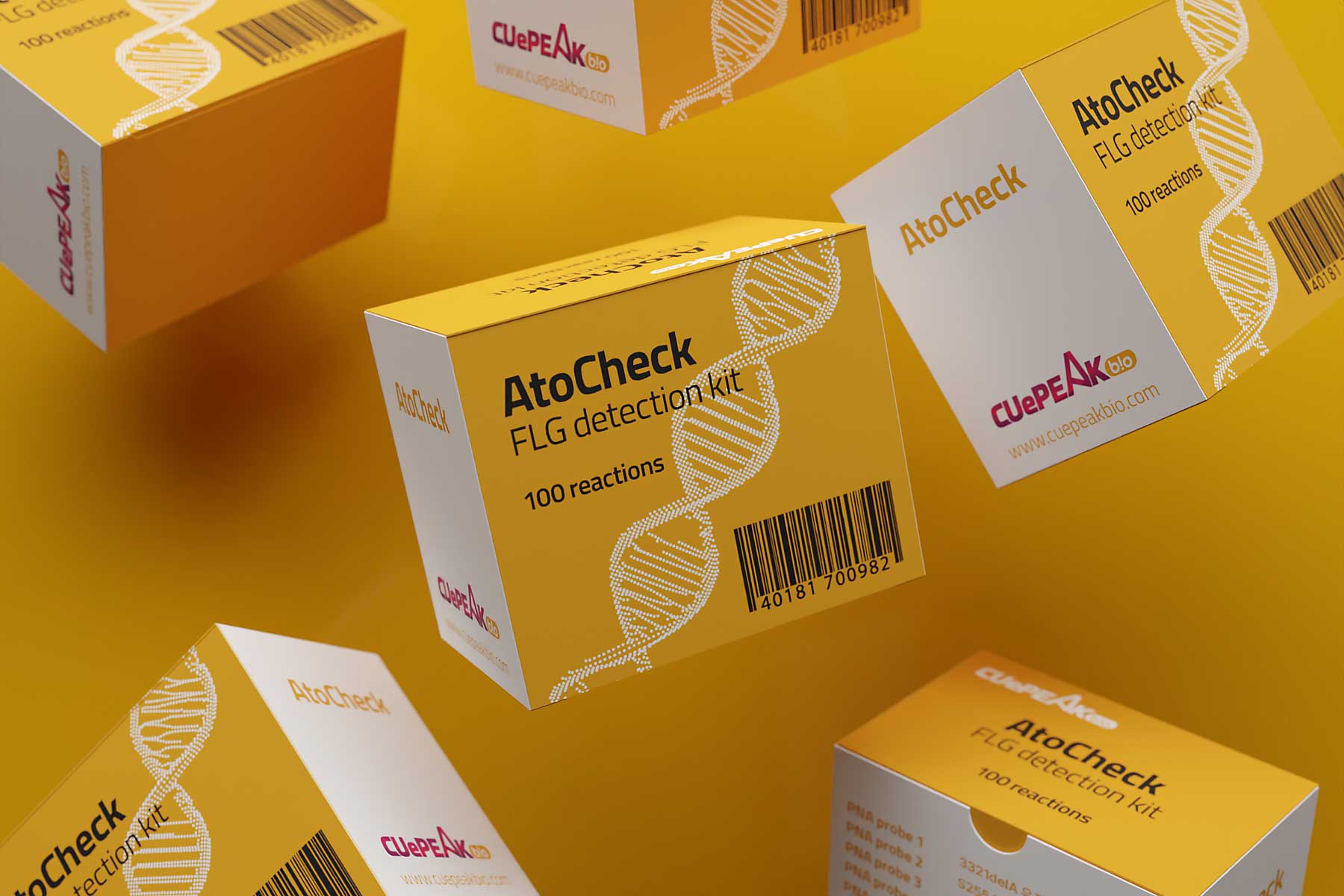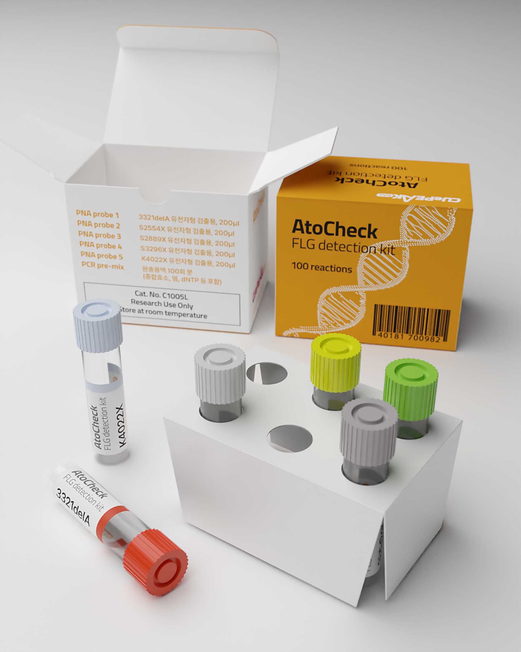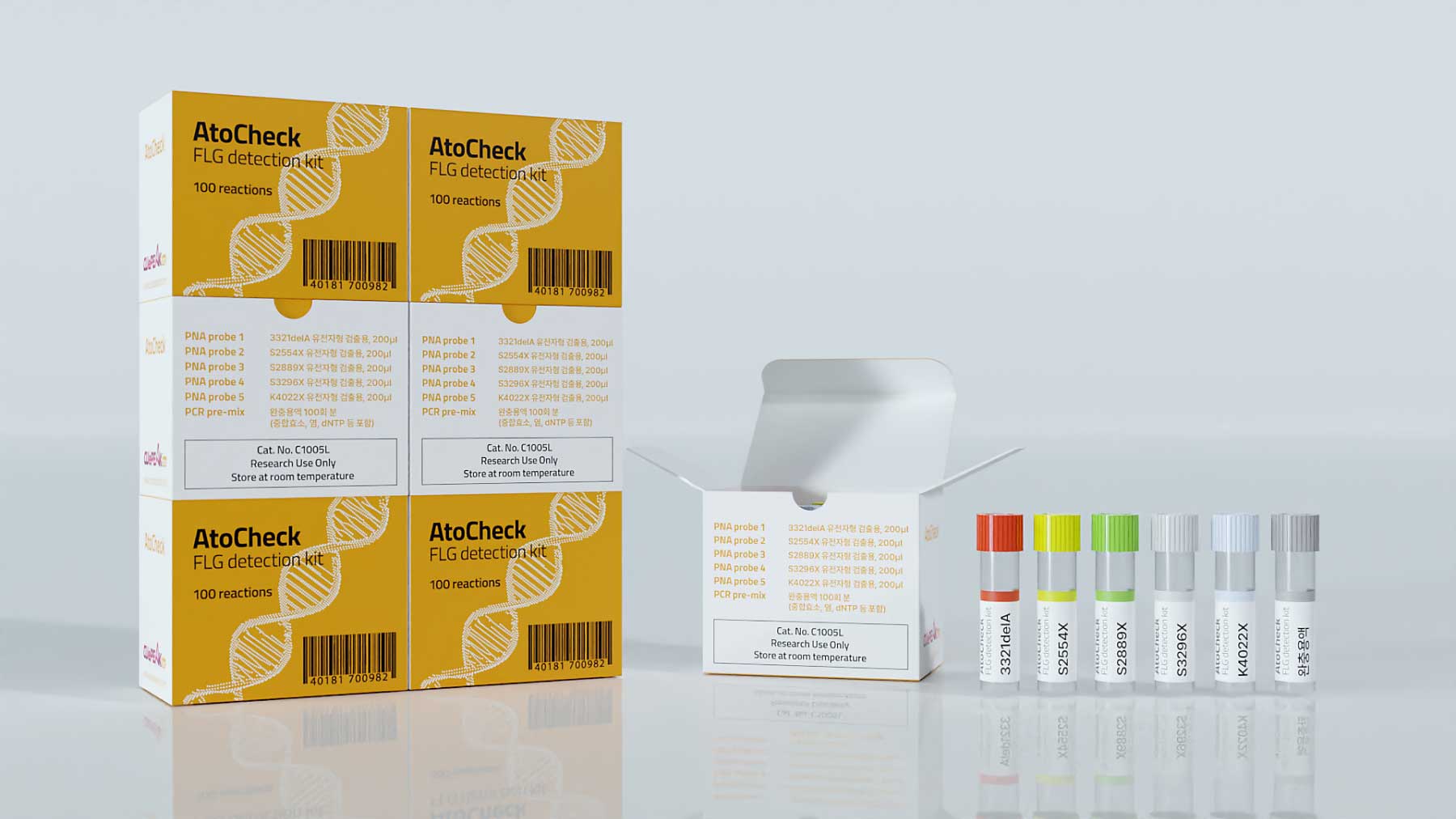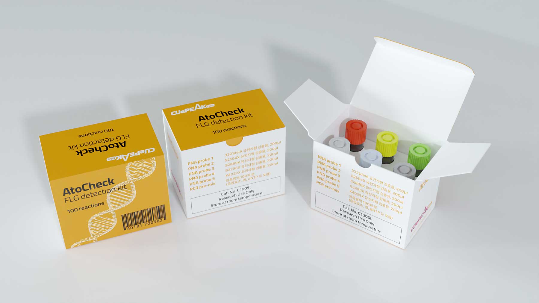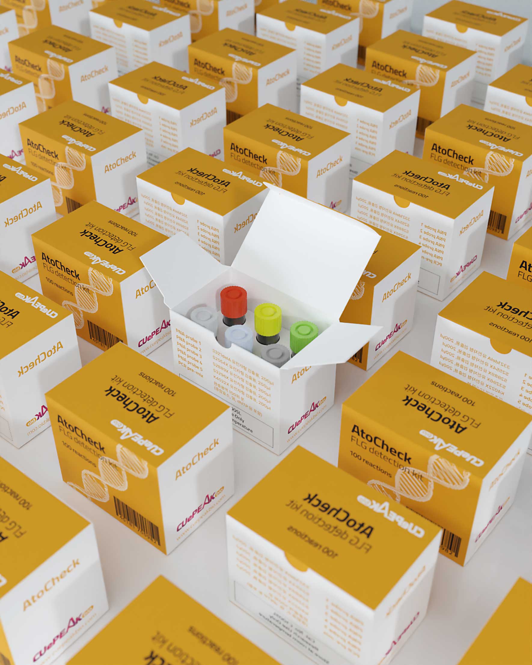 (주)큐피크바이오는 피부질환 토탈 솔루션 프로바이더로 바이오벤처 기업입니다. 뛰어난 기술력과 글로벌 오픈 이노베이션을 목표로 인류 건강과 삶의 질 향상에 공헌하고 있습니다. 본 패키지는 피부질환의 원인 중 하나인 필라그린의 유전자검출용 키트이며, 기업 아이덴티티 컬러에 맞춰 심플하게 디자인 하였고, 6가지 개별 색상으로 시약 구분을 하고 있습니다.
