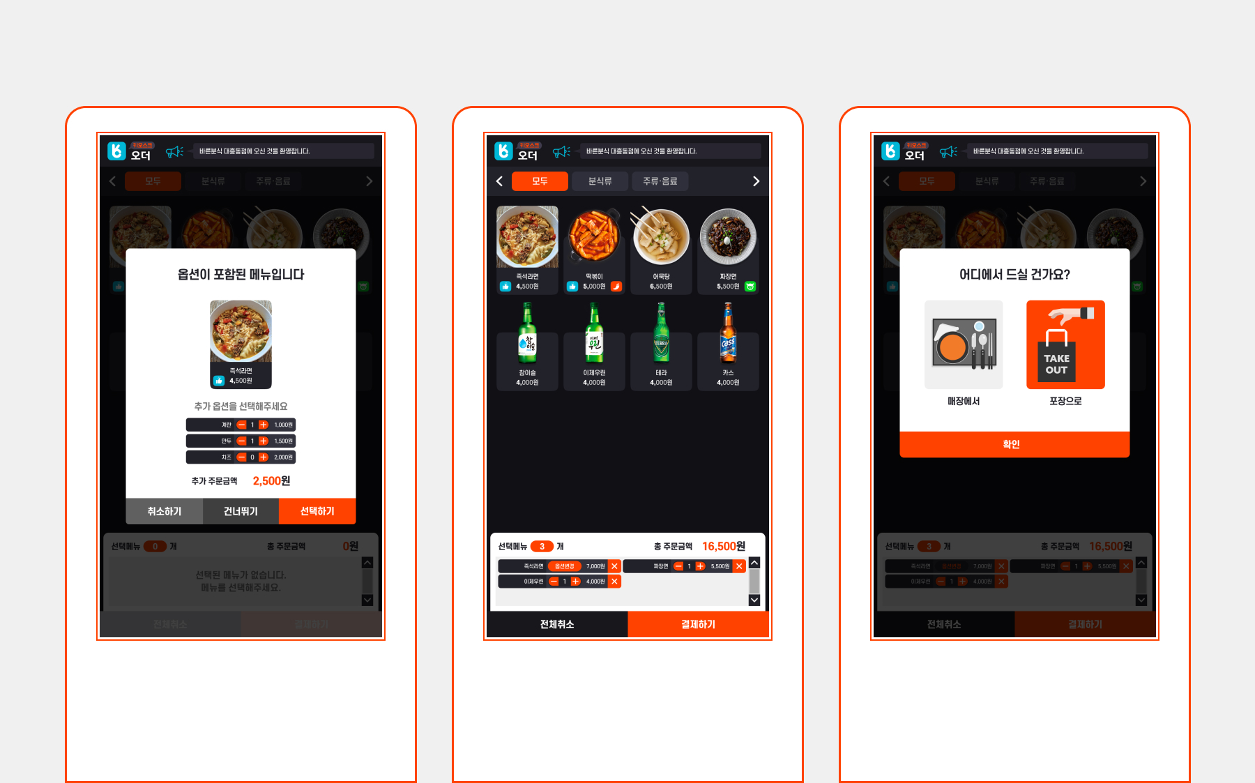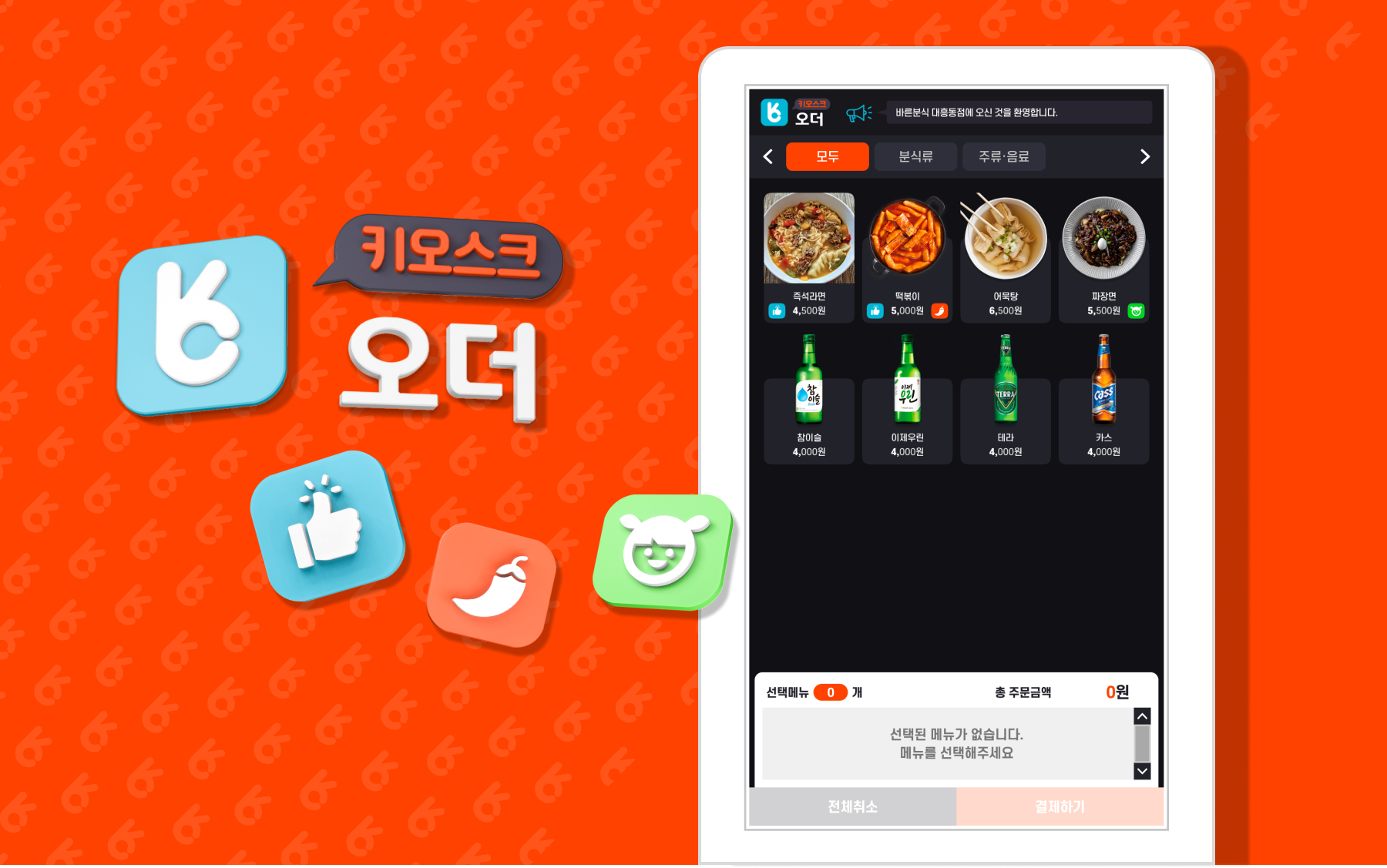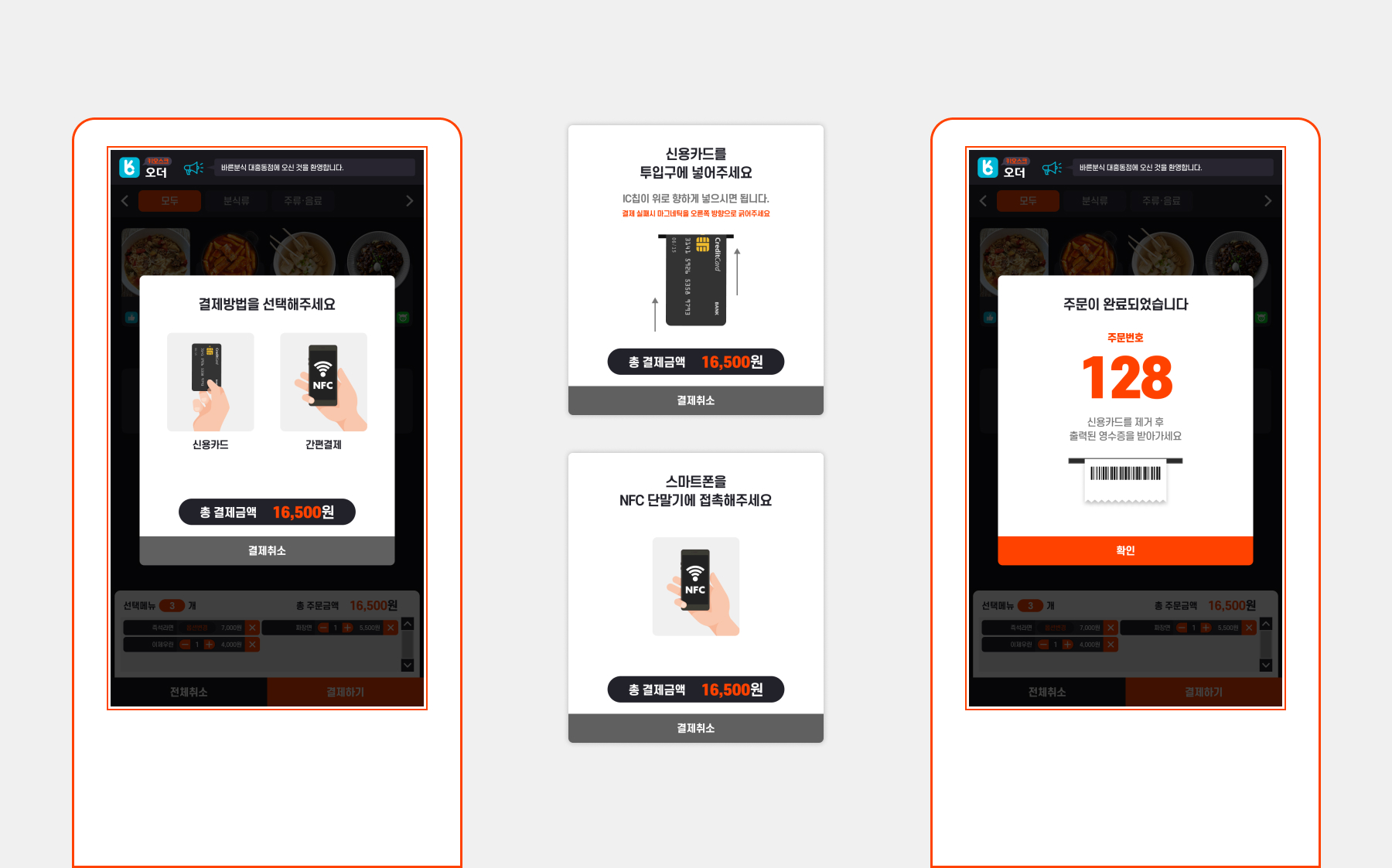키오스크 오더는 문자 그대로 디지털 스크린에 터치스크린 인터페이스를 갖춘 키오스크에서 음식을 주문하는 앱이다. 주문할 메뉴를 쉽고 편리하게 고르고 다양한 결제 방식을 사용할 수 있다. 빨간색을 포인트 컬러로 사용하여 식욕을 자극하며, 상호작용이 일어나는 부분에 주목할 수 있도록 하였다. 다양한 음식 색상에 대응하고 돋보일 수 있도록 배경 색상은 채도와 명도를 낮췄다. 버튼과 글자의 크기는 스크린 크기에 대응하여 정확성과 주목성이 최대화 되도록 설정하였다.