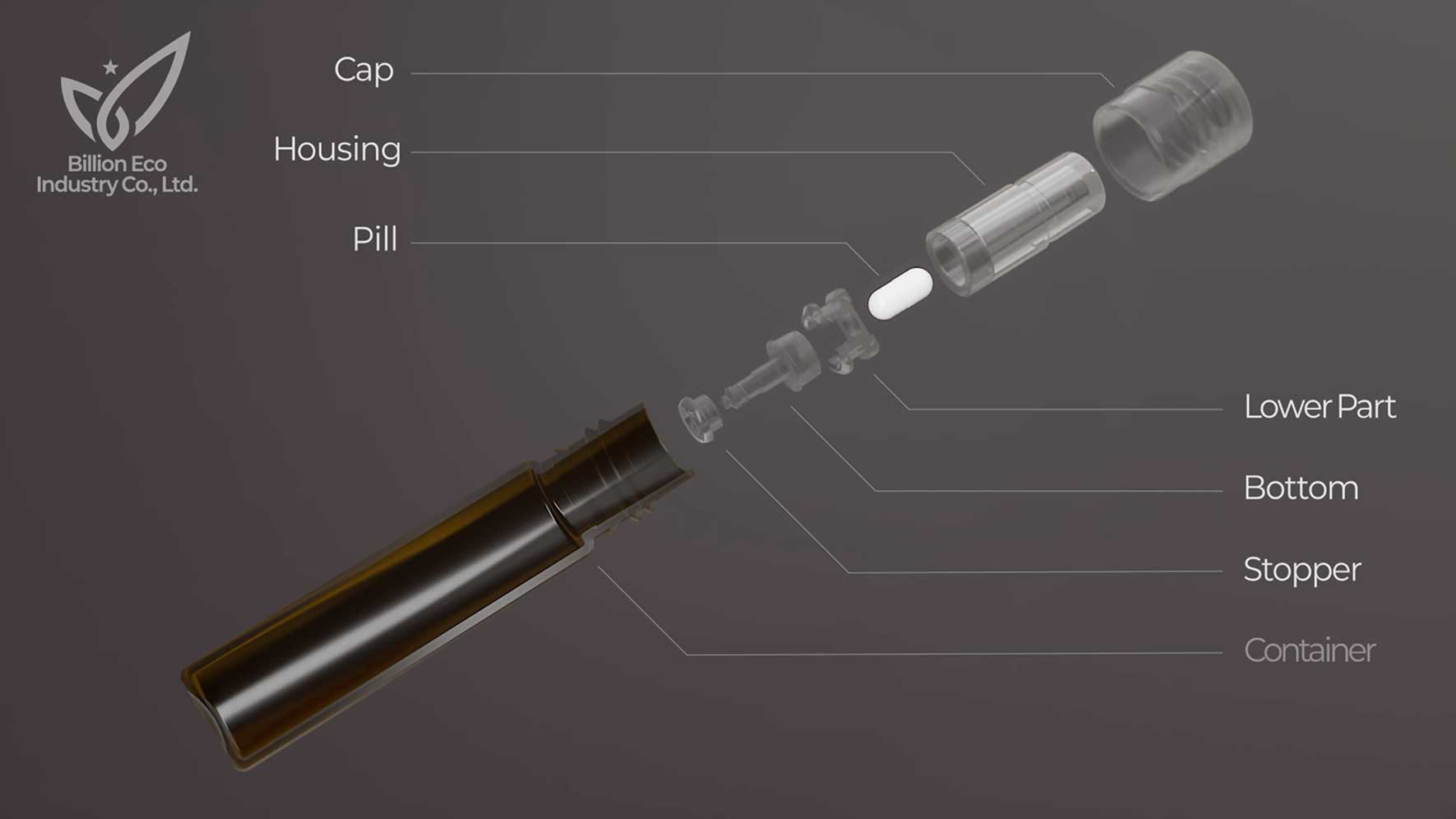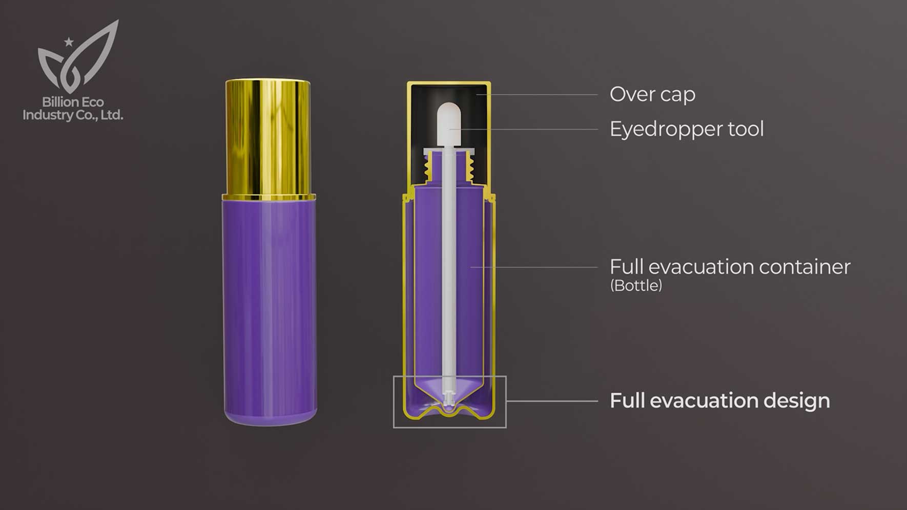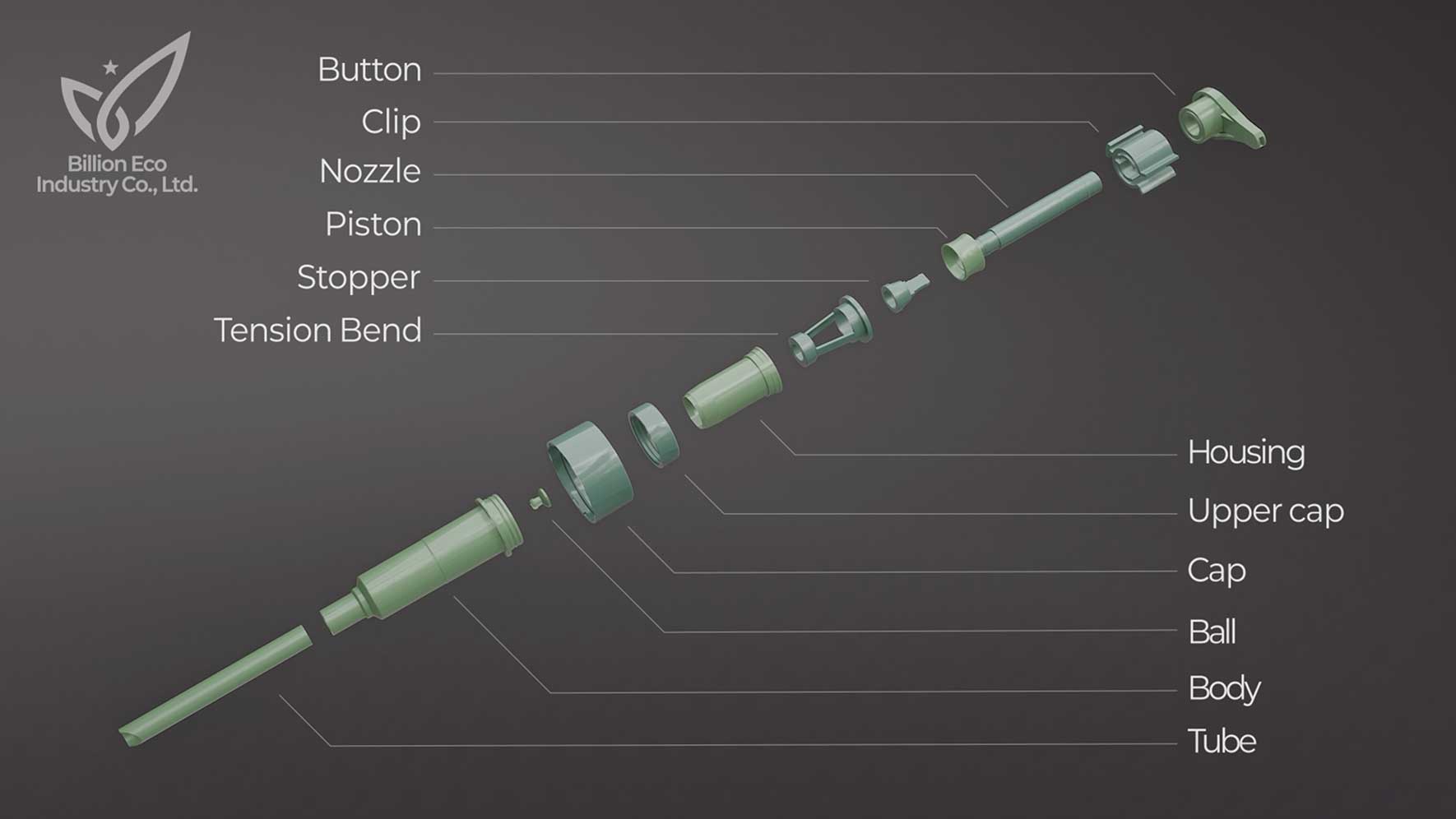 제품 내부의 복잡한 구조(버튼, 피스톤, 스프링, 하우징, 캡, 튜브 등)와 각 부품의 결합 방식을 명확하게 보여주기 위해 분해 조립 시퀀스를 시각화했습니다. 펌핑 메커니즘, 액체 토출 과정 및 잔량 없이 사용하는 'Full Evacuation Design'과 같은 핵심 기능의 작동 원리를 직관적으로 이해할 수 있도록 표현했습니다. 또한 주문 요구에 따라 다양한 형태와 색상으로 외관 구현이 가능함을 보여주는 시안들을 함께 제시했습니다.