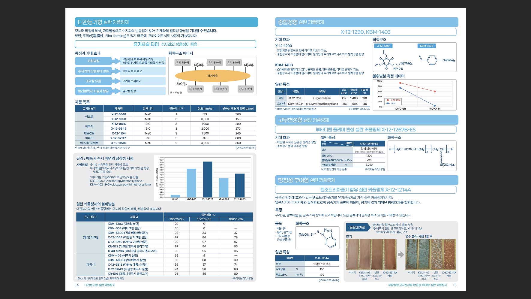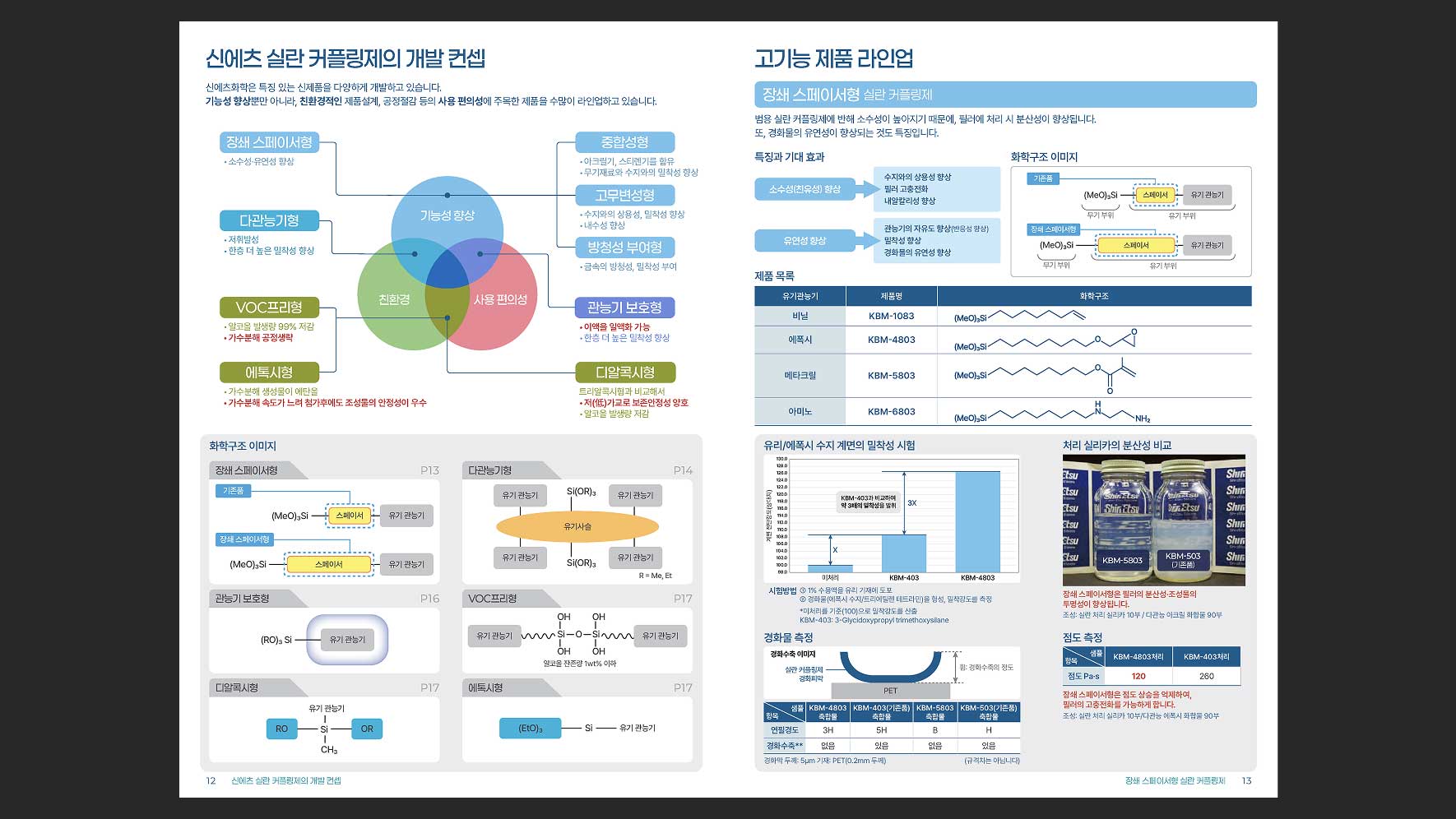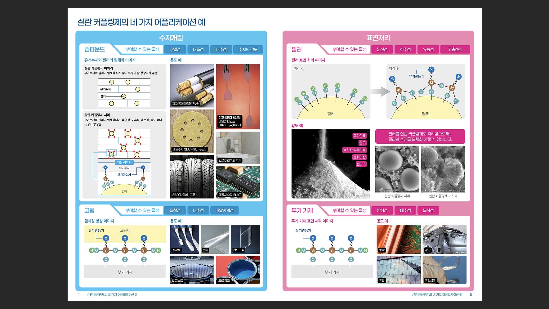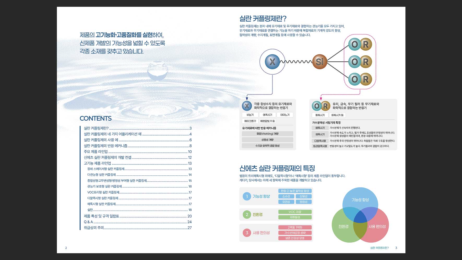 한국신에츠실리콘(주)의 제품 중 하나인 Silane Coupling Agents를 소개하는 브로셔의 디자인