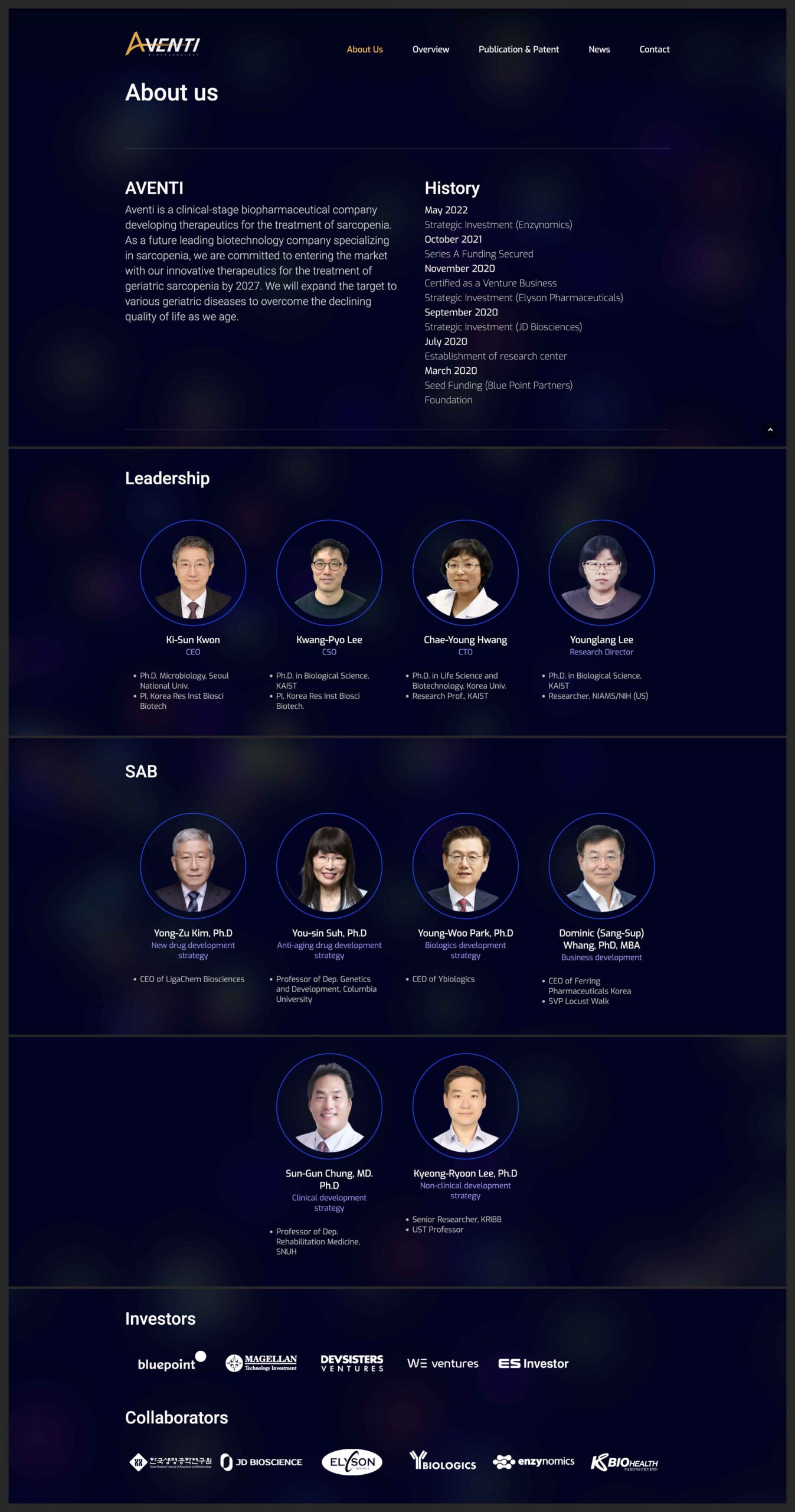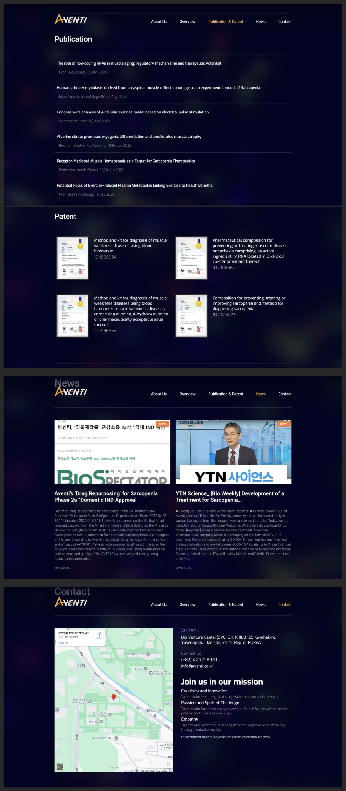 (주)아벤티 웹사이트 프로젝트는 클리니컬 임상 단계에 있는 바이오제약 기업의 브랜드 아이덴티티를 디지털 공간에서 명확하고 강렬하게 전달하기 위해 기획되었습니다. 배경에 희미하게 노출되는 입자의 애니메이션은 생명공학과 과학적 직관의 분위기를 조성합니다. 컨텐츠는 특히 노인성 근감소증 치료제를 핵심으로 하는 기술력과 미래 비전을 반영하는 데 중점을 두었습니다. 이번 프로젝트는 고령화 사회에서 주목받는 바이오 헬스케어 분야의 혁신 기업 이미지를 구축하고, 복잡한 의학 정보를 직관적이고 이해하기 쉬운 UX 구조로 설계하였습니다. 연구개발(R&D) 역량 및 임상 진행 상황을 신뢰감 있게 전달함으로써 투자자 및 파트너사와의 소통 강화를 기대합니다. 웹사이트는 최신 웹 표준 기반의 반응형 웹 디자인 적용으로 모든 디바이스 화면에 최적화되었습니다.