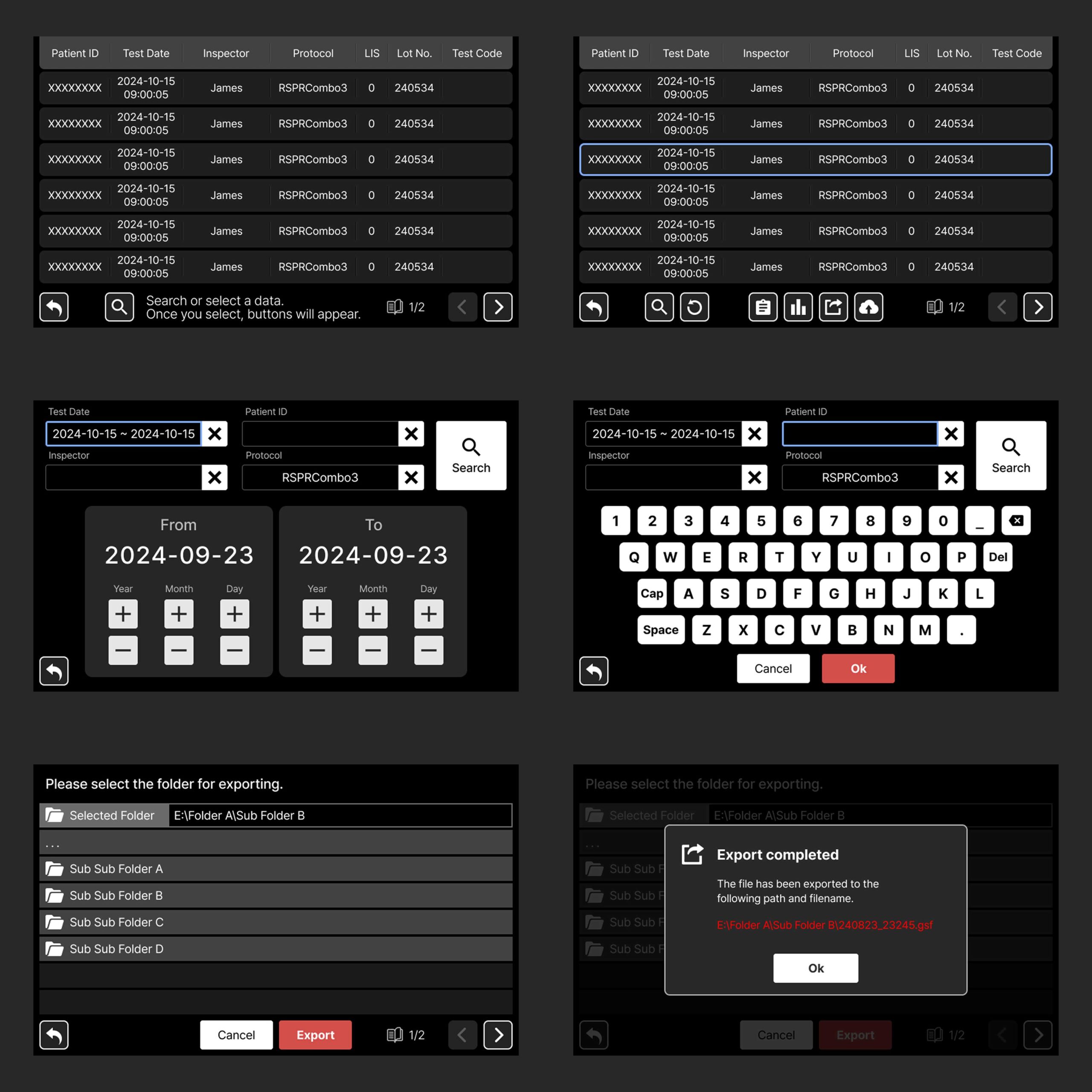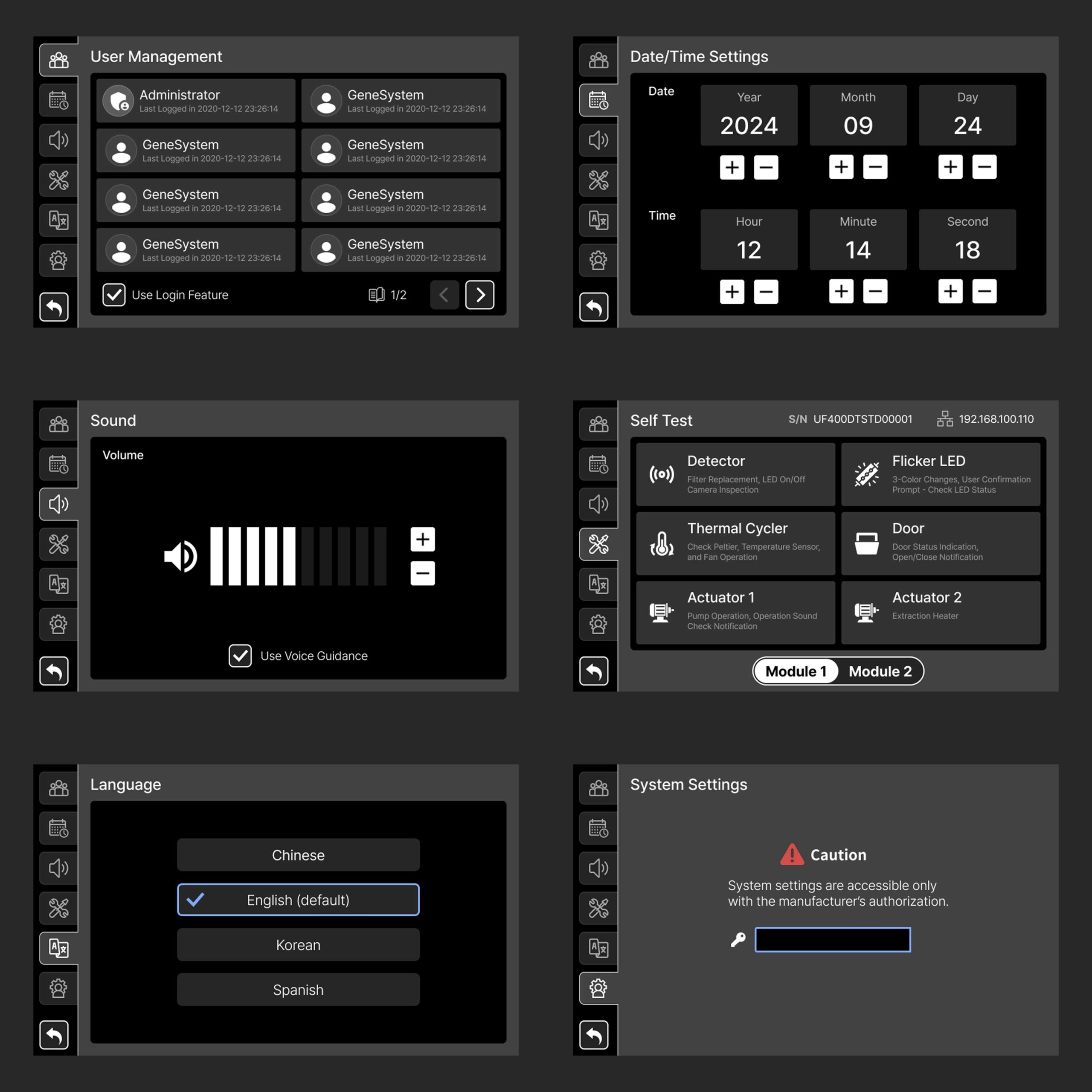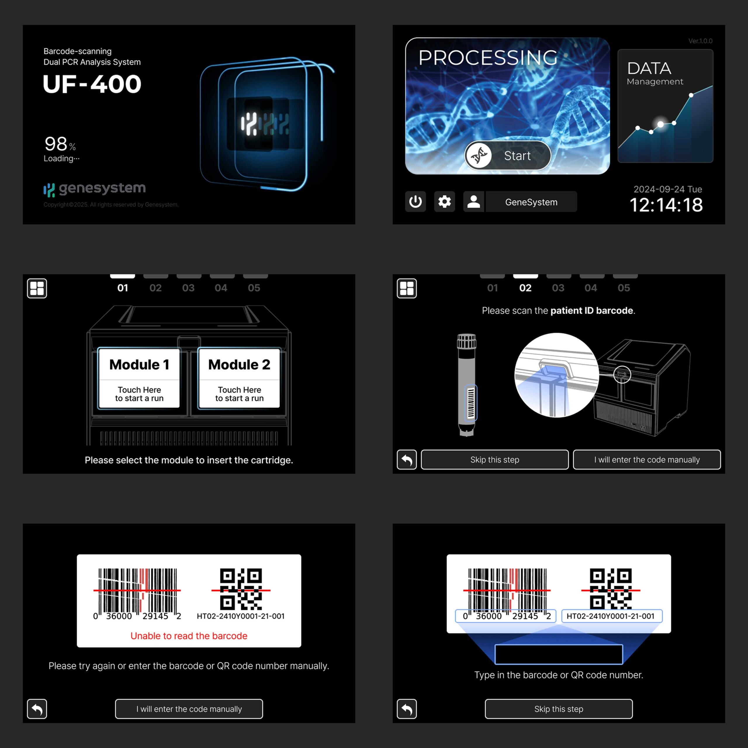 본 프로젝트는 GeneSystem의 바코드 스캐닝 기반 듀얼 PCR 분석 시스템 UF-400을 위한 임베디드 소프트웨어 GUI 및 UX 구축 작업으로, 정밀 의료·실험실 환경에서의 복잡한 분석 과정을 직관적으로 시각화하고 사용자 오류를 최소화하는 데 초점을 두었습니다. 다크 모드와 고대비 디자인으로 다양한 조명 조건에서도 시인성을 확보하고, 브랜드 컬러인 네온 시안과 일렉트릭 블루를 포인트로 활용해 정보의 위계를 명확히 했습니다. 위저드 방식의 단계별 워크플로우로 복잡한 하드웨어 조작을 쉽게 유도하고, 라인 일러스트와 애니메이션을 통해 물리적 조작 단계의 직관성을 강화했습니다. 실시간 분석 대시보드는 원형 진행 바와 남은 시간 표시로 상태를 즉각 인지할 수 있게 구성했으며, 그리드 기반의 모듈형 레이아웃으로 데이터 가독성을 높였습니다. 또한 터치스크린용 가상 키패드, 컬러 코딩된 시스템 피드백, 탭 구조의 관리 화면을 통해 효율적인 운영과 사용자 편의를 지원합니다. UF-400 UI/UX 디자인은 기존 실험 장비의 복잡함을 벗어나 첨단성과 인간 중심 경험을 결합해, 의료 현장의 업무 효율을 극대화한 솔루션입니다.