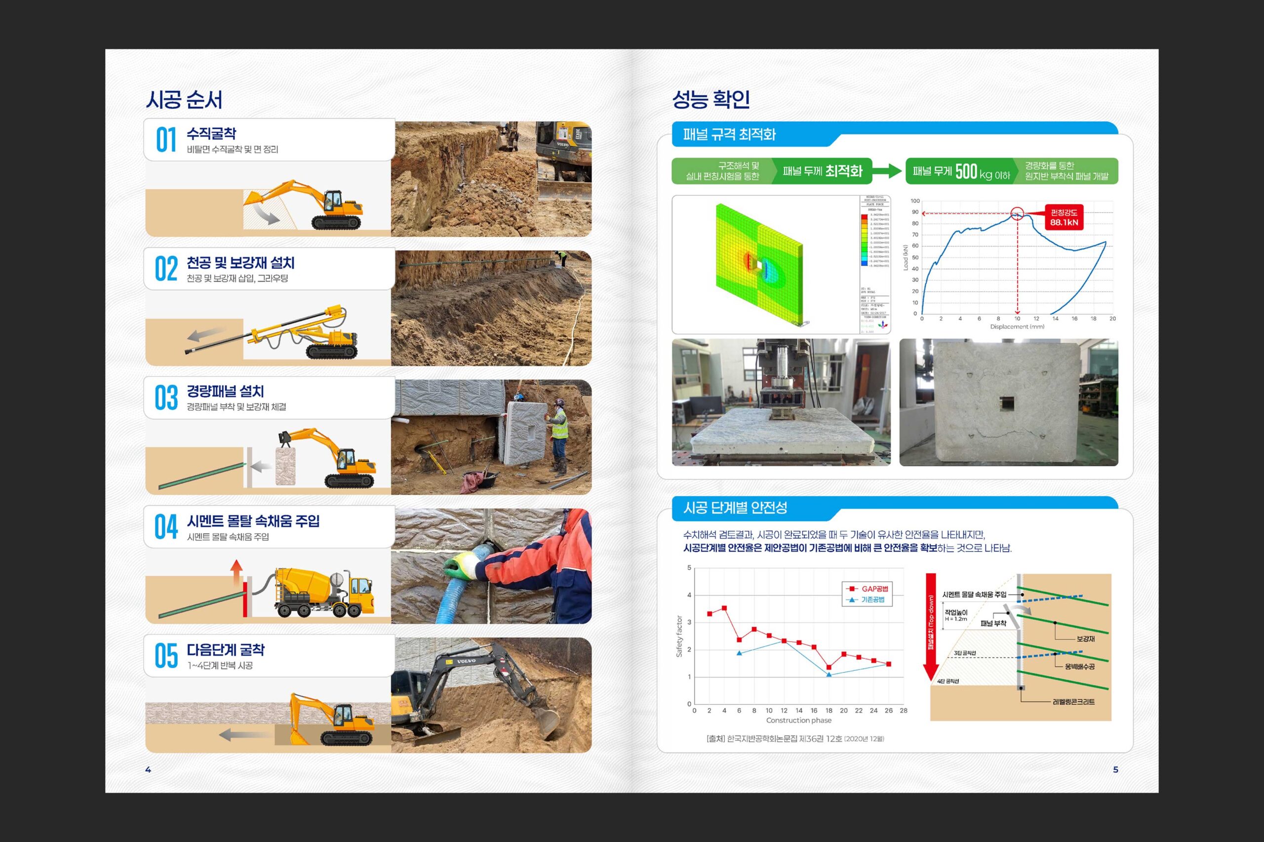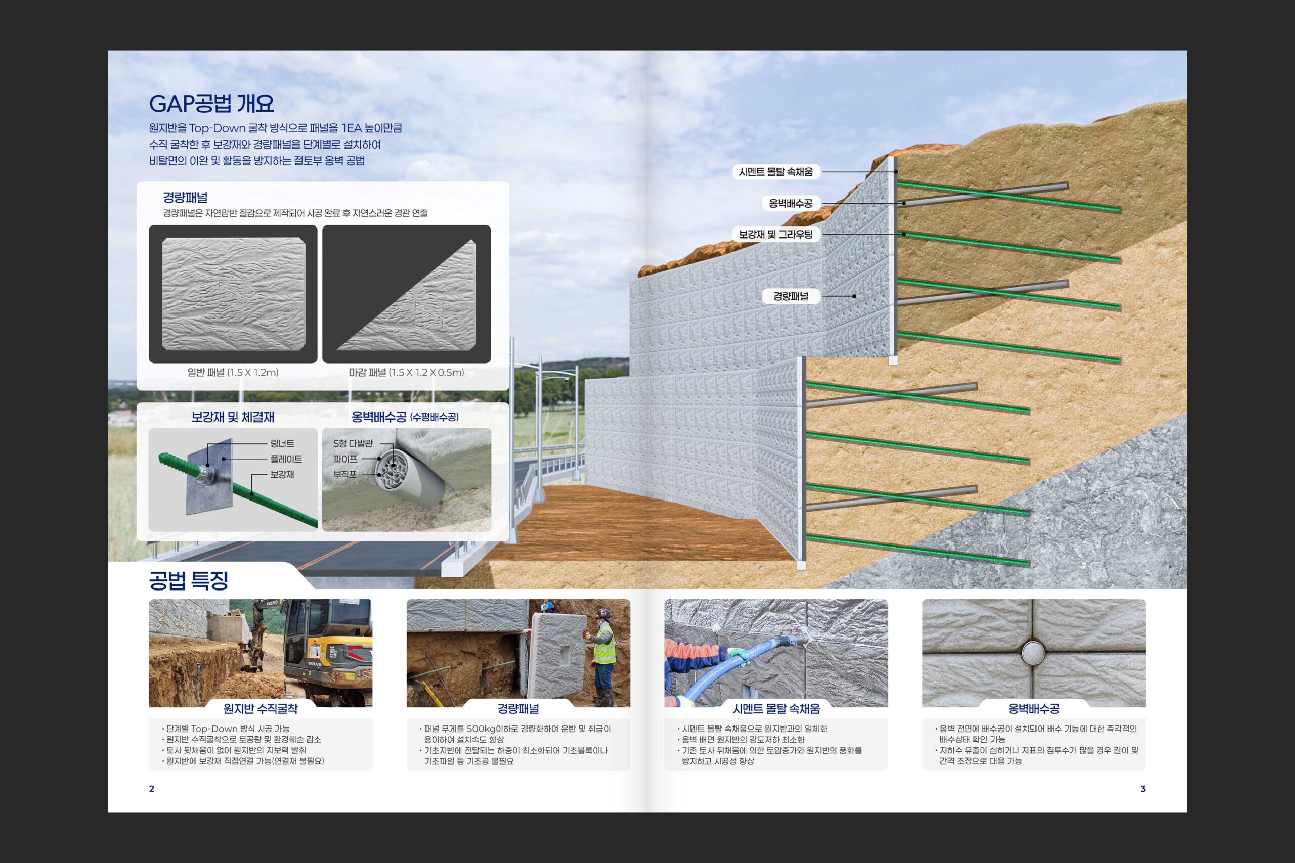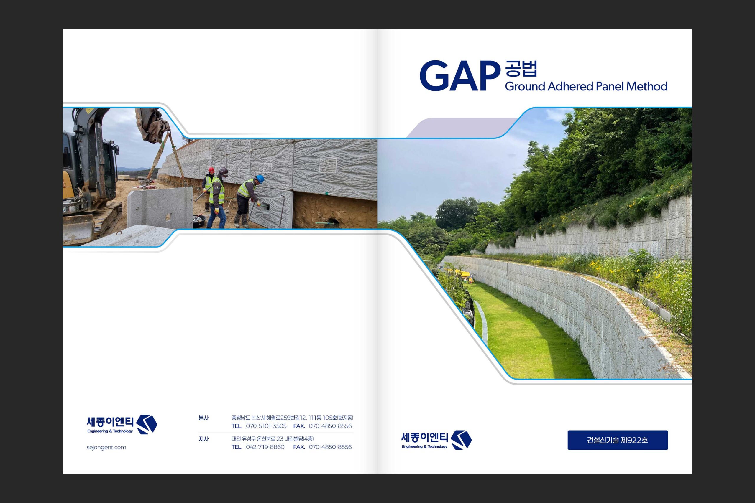 (주)세종이엔티의 경량 패널을 이용한 네일형 절토부 옹벽 공법인 ‘GAP 공법’을 소개하는 브로셔의 디자인