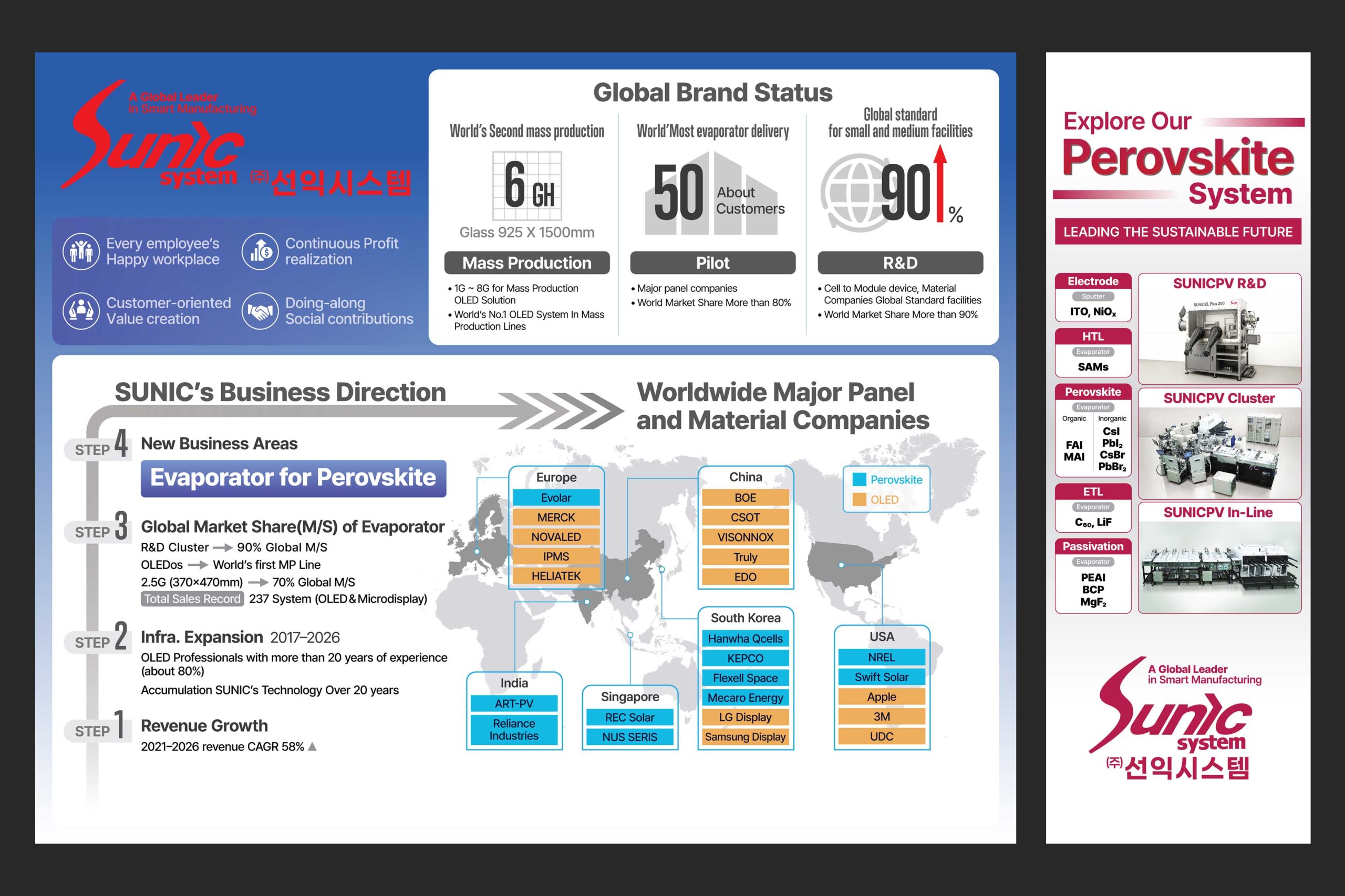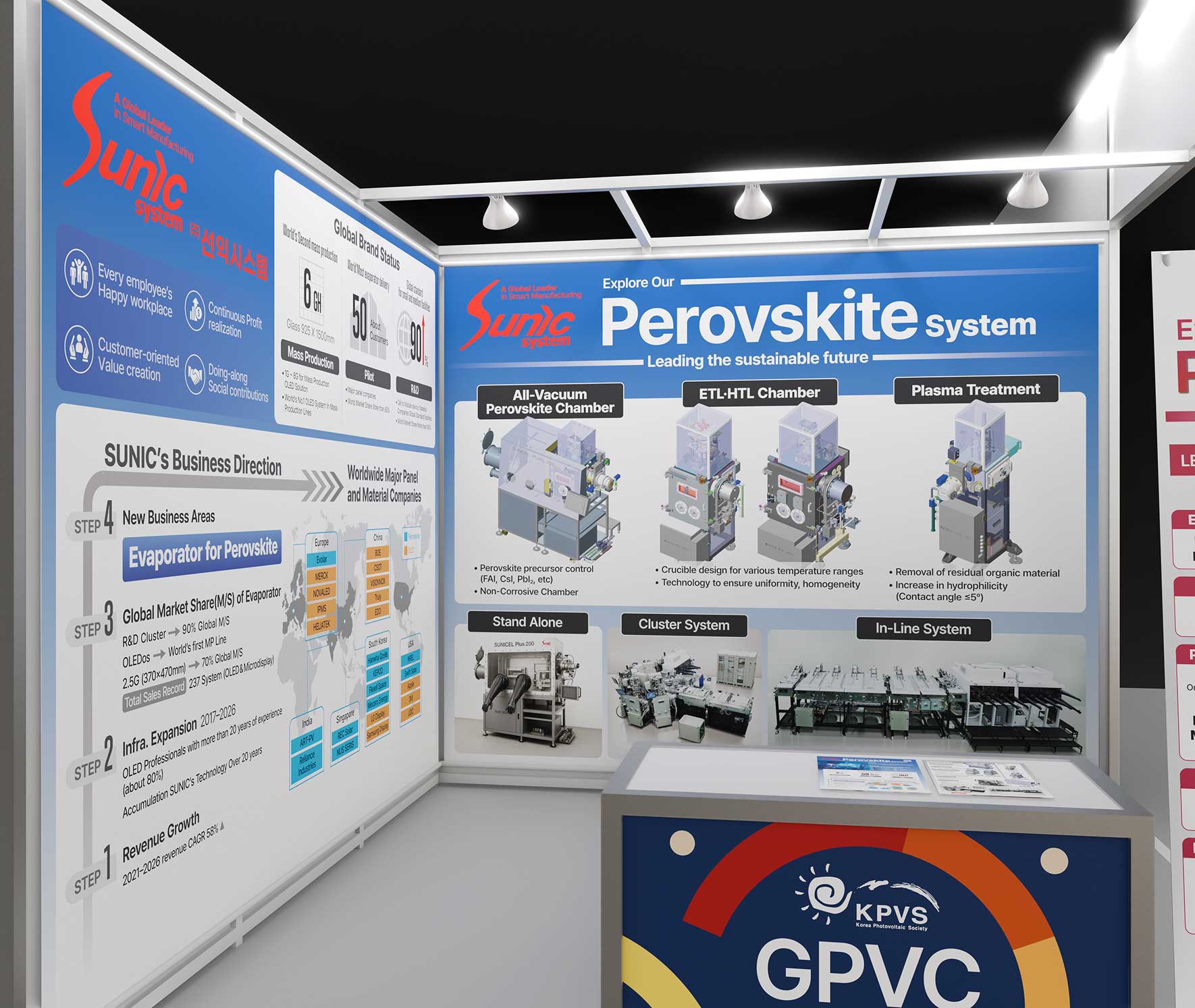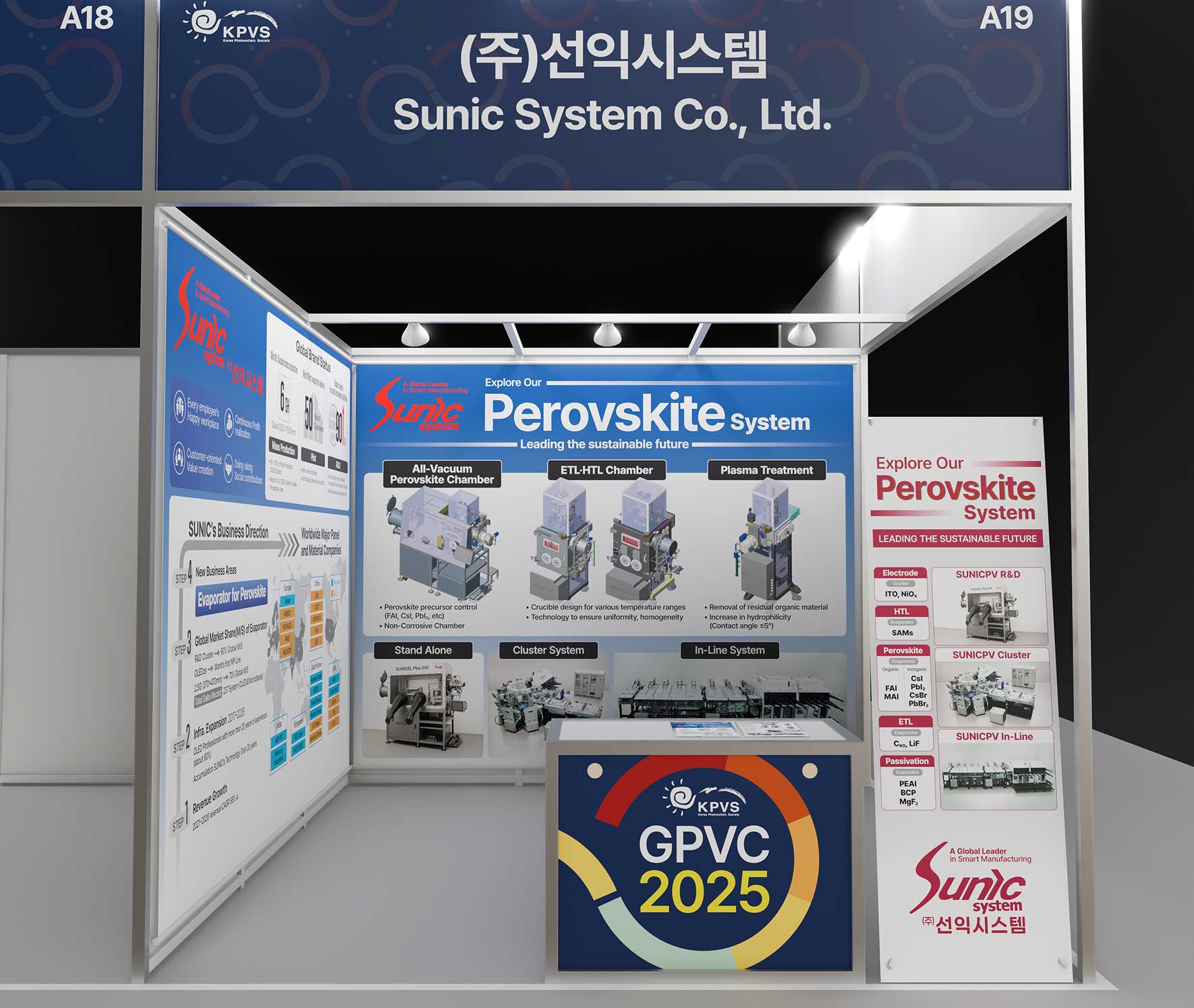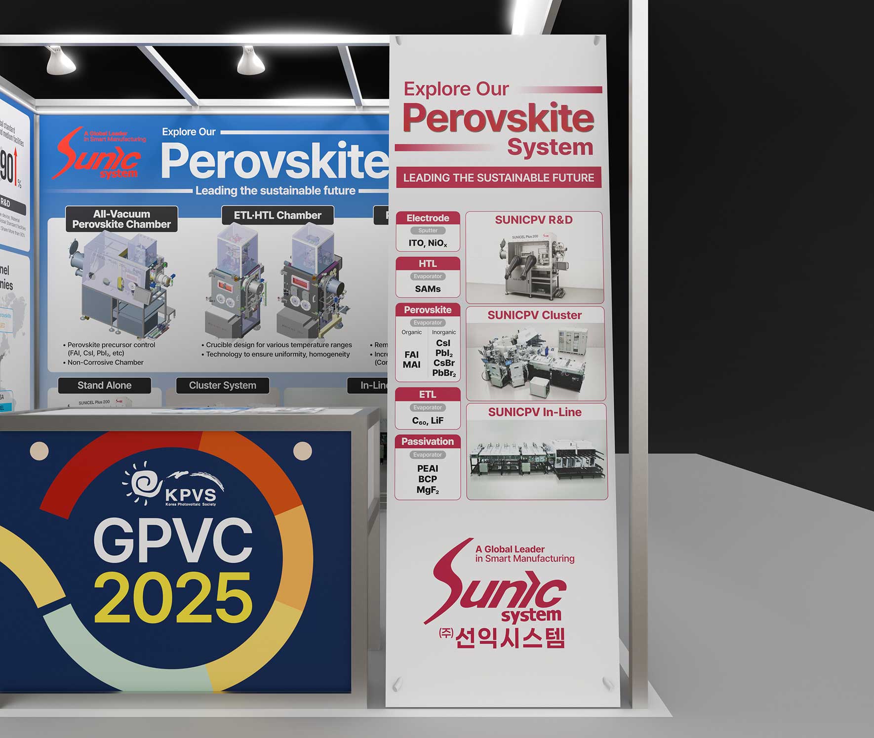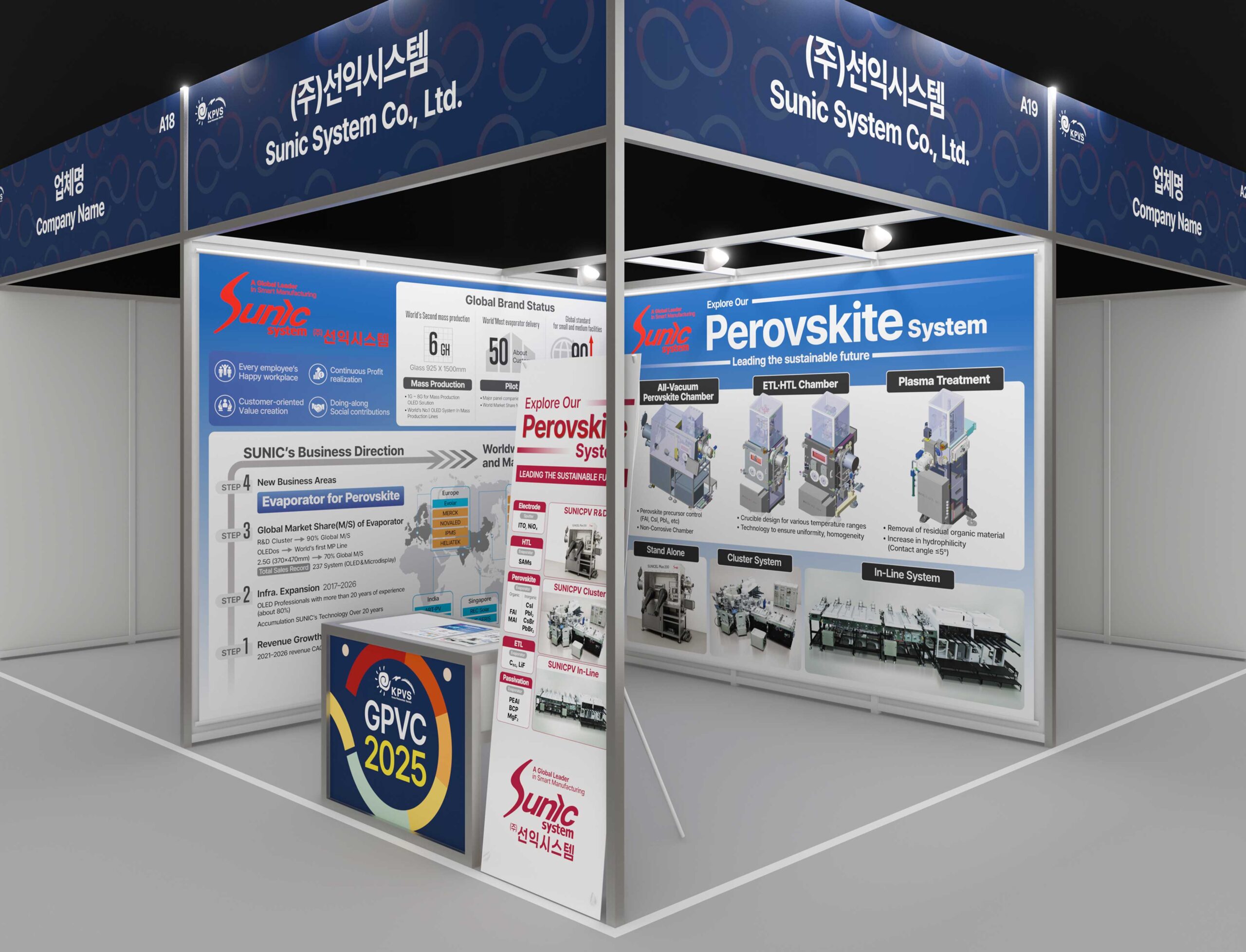 주식회사 선익시스템은 OLED 디스플레이 제조 공정에 사용되는 증착기를 개발 제조하는 것이 주력 사업입니다. GPVC 2025는 글로벌태양광컨퍼런스로 대전컨벤션센터에서 개최되었다. 전시 부스에 사용할 가로 3미터 실사출력물과 양면 전단지, X형 배너, 학회지 광고지면을 디자인하였다. 전시 부스는 가능하면 클라이언트의 이해를 돕기 위해 현장을 3D로 제작한 시안을 제시하고 있다.