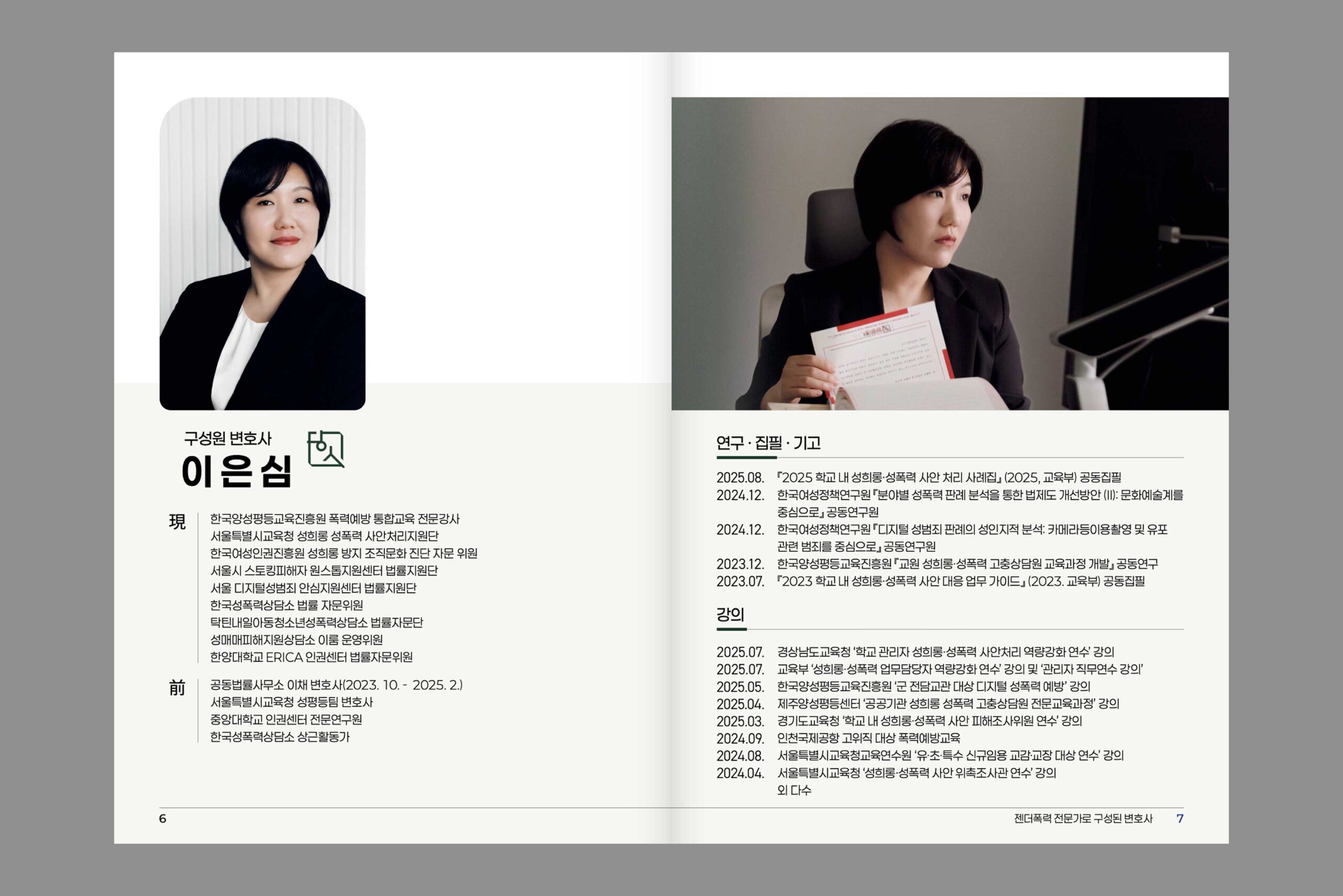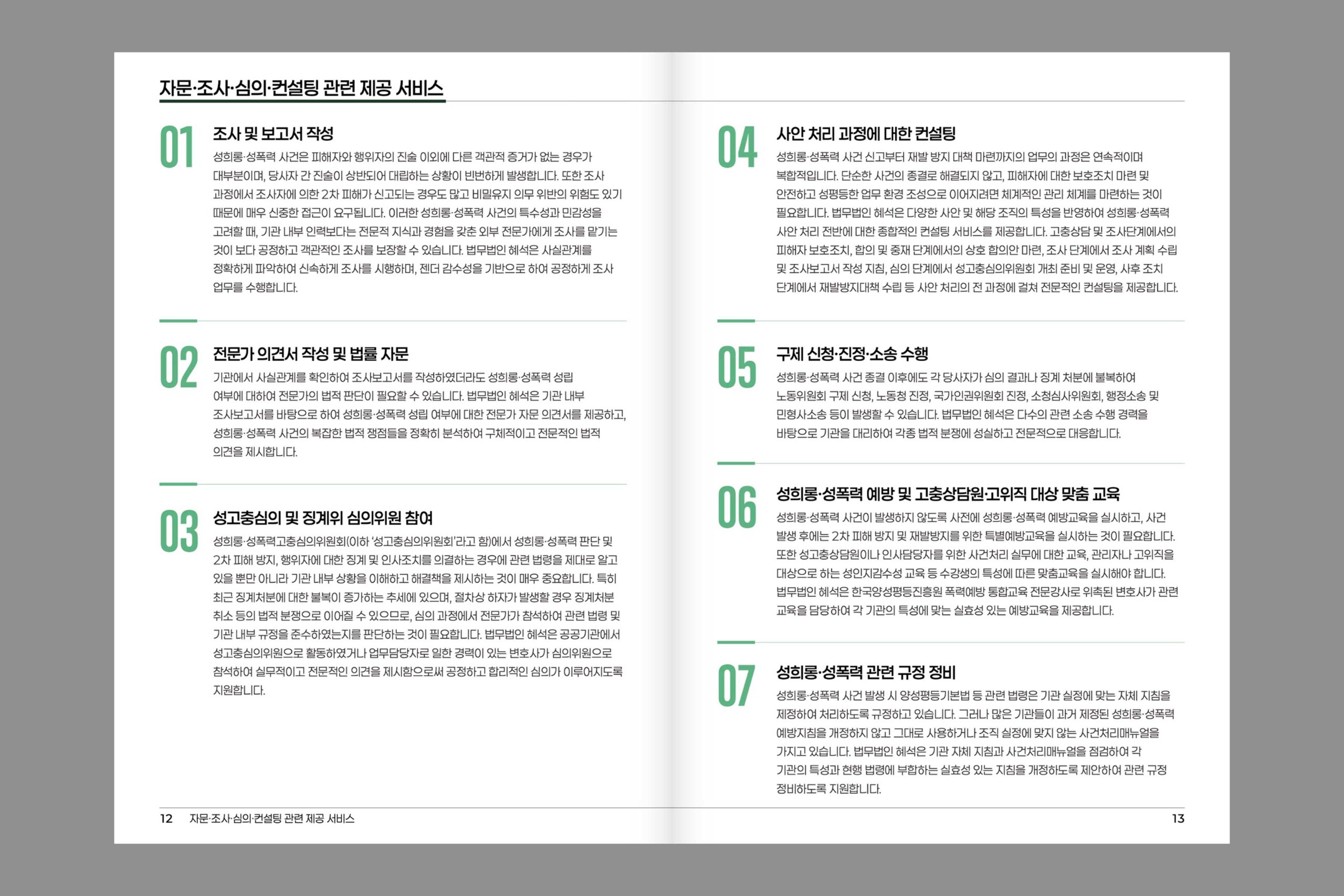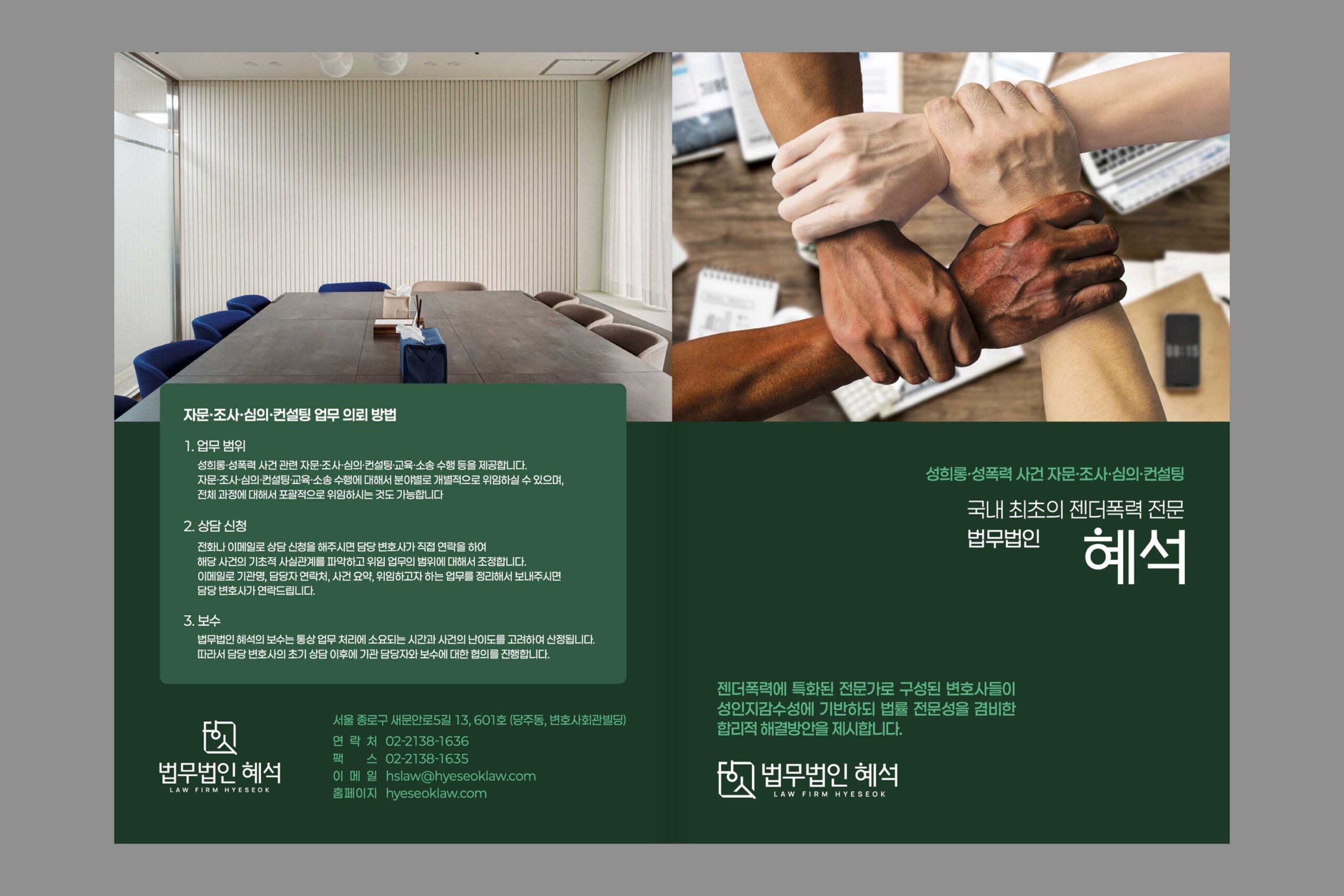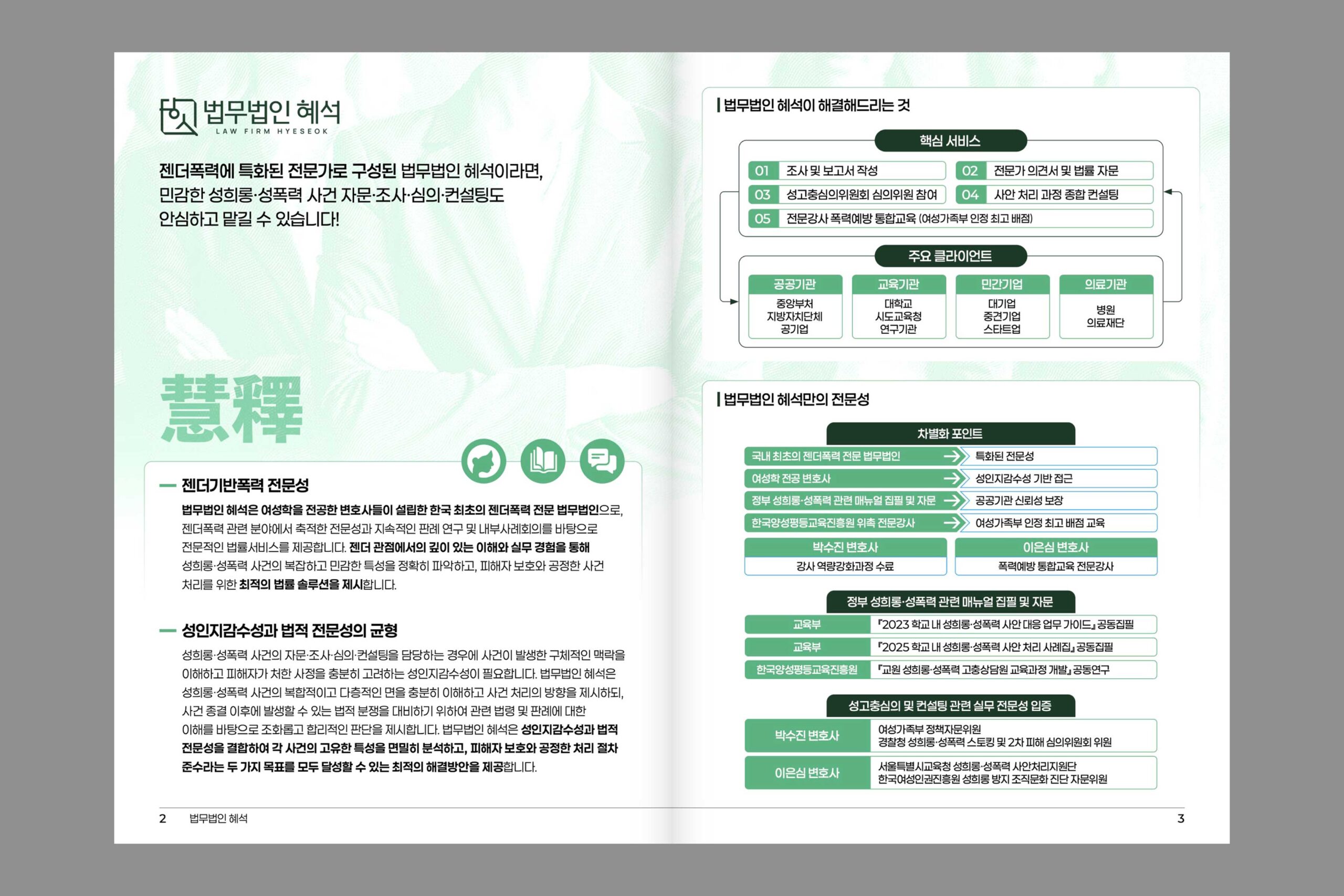 젠더폭력 사건을 중심으로 다루는 법무법인 혜석의 관공서 및 기관에 배포할 홍보 브로셔