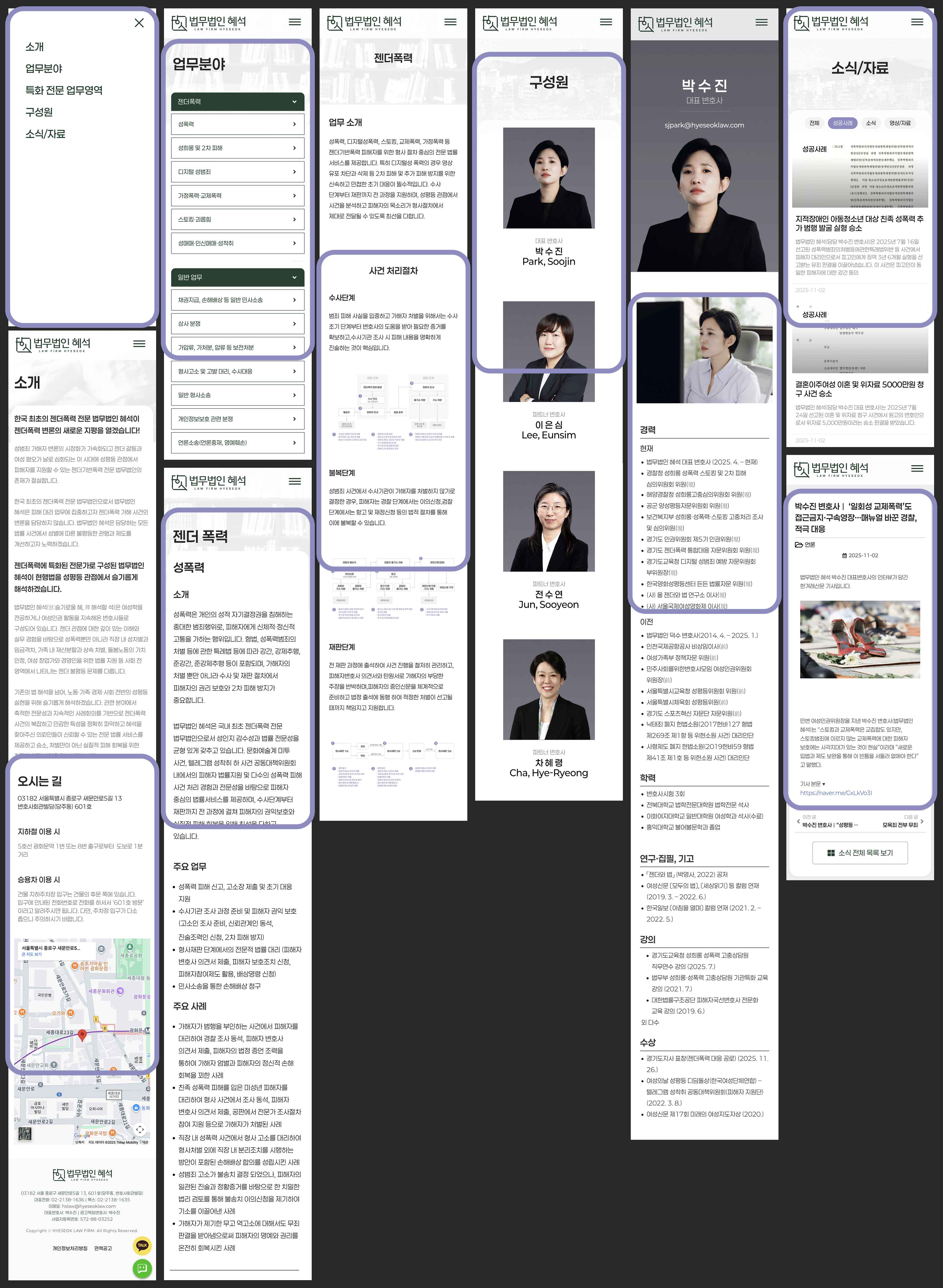 법무법인 혜석은 국내 최초의 젠더폭력 전문 법무법인입니다. 웹사이트의 전체적인 색감은 흰색으로 보라색을 포인트 컬러로 사용하였습니다. 법무법인 소개와 주요 영역, 변호사 소개, 사건 진행 절차, 소식 및 자료 등의 내용으로 구성하였으며, 영상 및 디자인 요소들은 클라이언트의 피드백을 최대한 반영하였습니다. 웹사이트는 최신 웹 표준 기반의 반응형 웹 디자인 적용으로 모든 디바이스 화면에 최적화되었습니다.