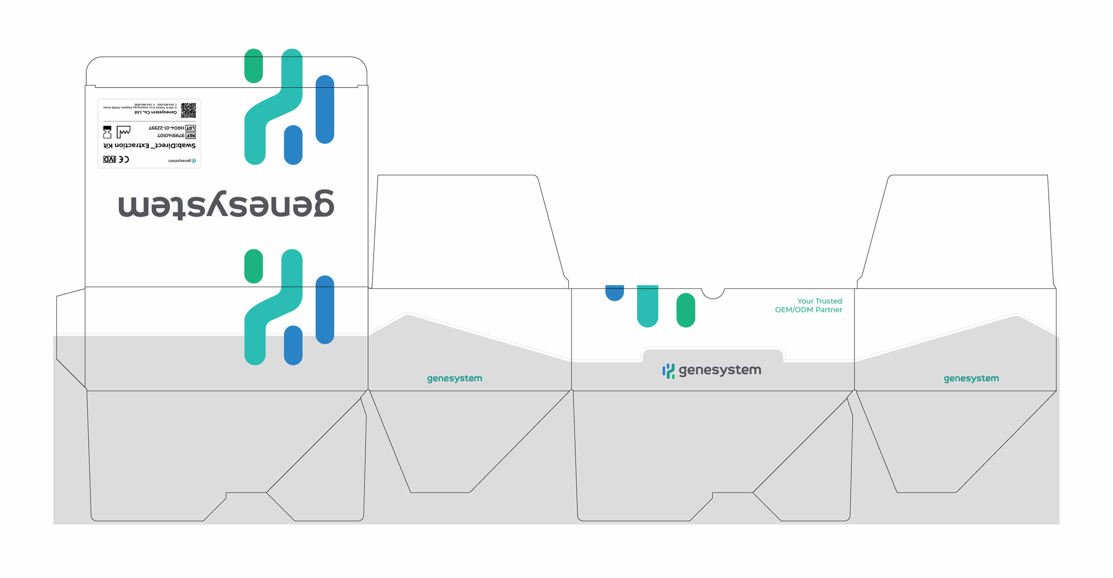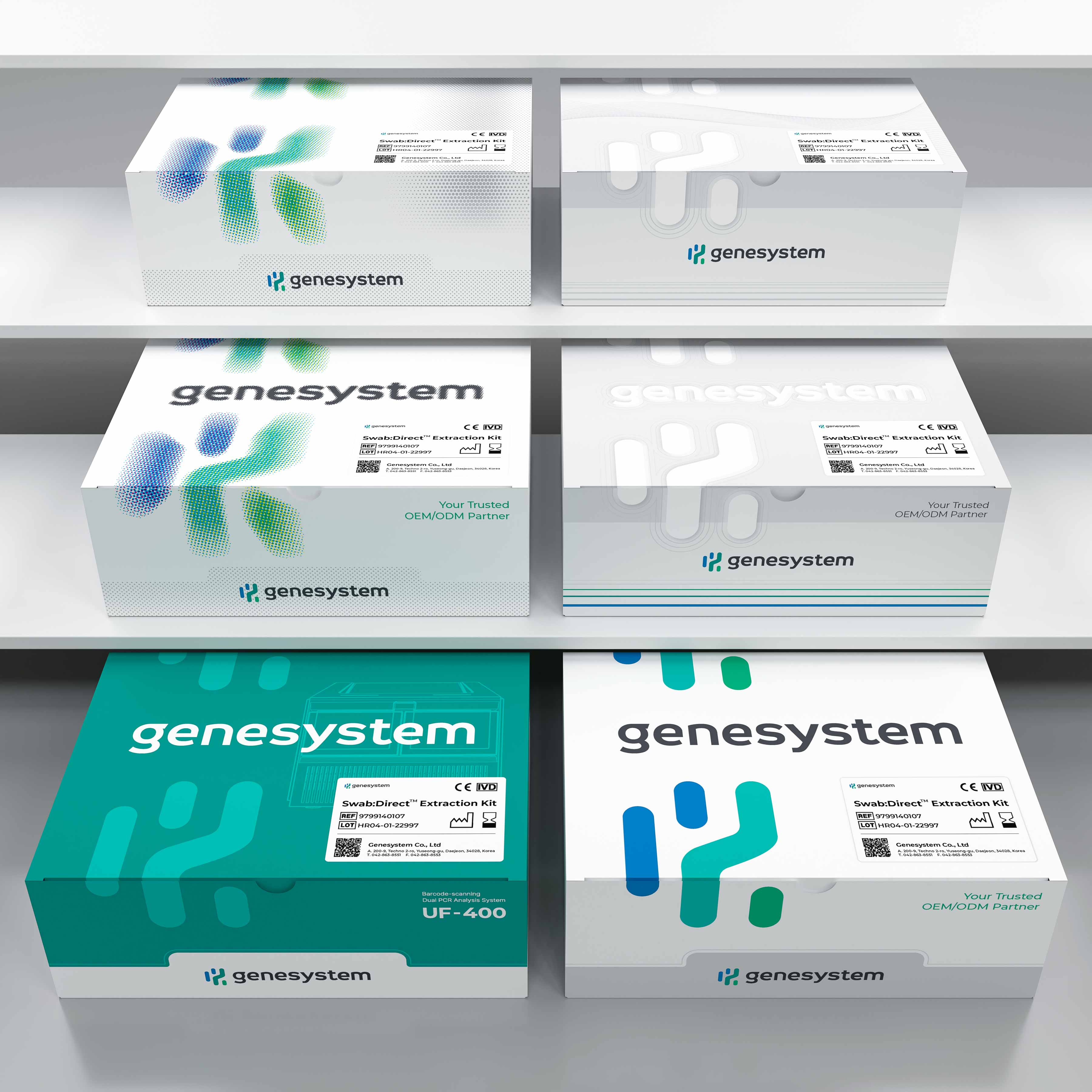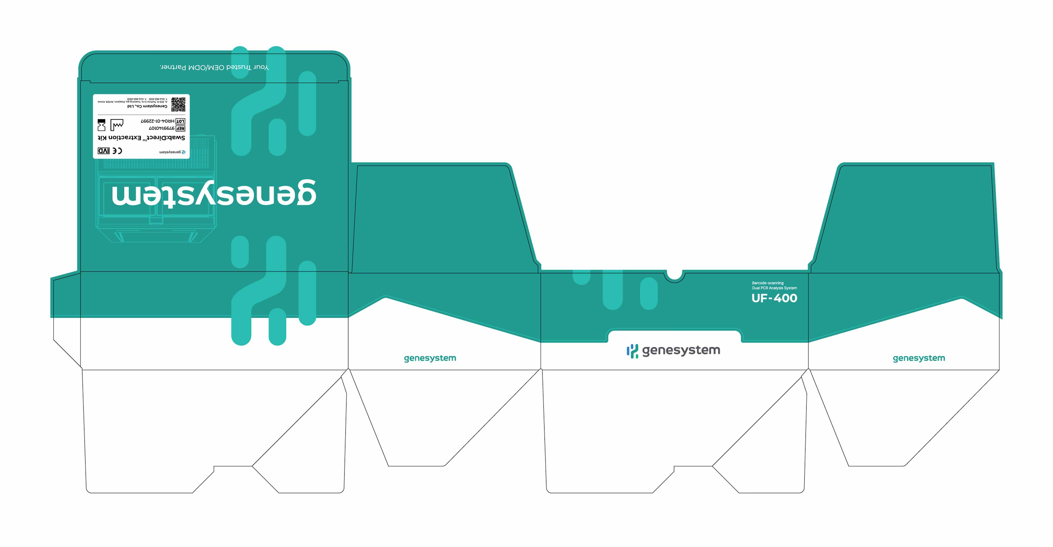 디자인 핵심 요소로 데이터와 유전자를 형상화한 진시스템의 심볼을 재구성하여 역동적인 흐름과 첨단 바이오 기술력을 표현합니다. 청결함과 전문성을 상징하는 흰색 지면에 브랜드 컬러인 테크니컬 그린과 딥 블루를 포인트 색상으로 활용했습니다. 특히 하프톤 패턴(Halftone Pattern)과 그라디언트를 활용하여 진단 과정의 정밀함을 드러내고자 하였습니다. 박스 덮개의 라벨링 구역은 실험실에서의 가독성을 우선하여 우측 하단에 배치했습니다. 제품명, 인증 마크(CE/ISO), QR 코드 등 필수 정보가 직관적으로 인식되도록 하였습니다.