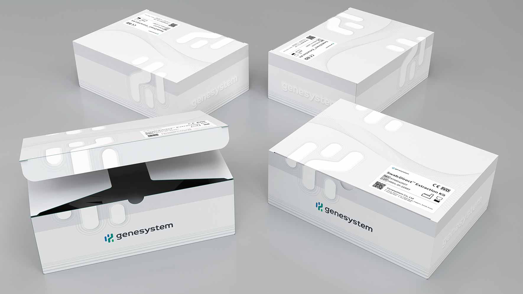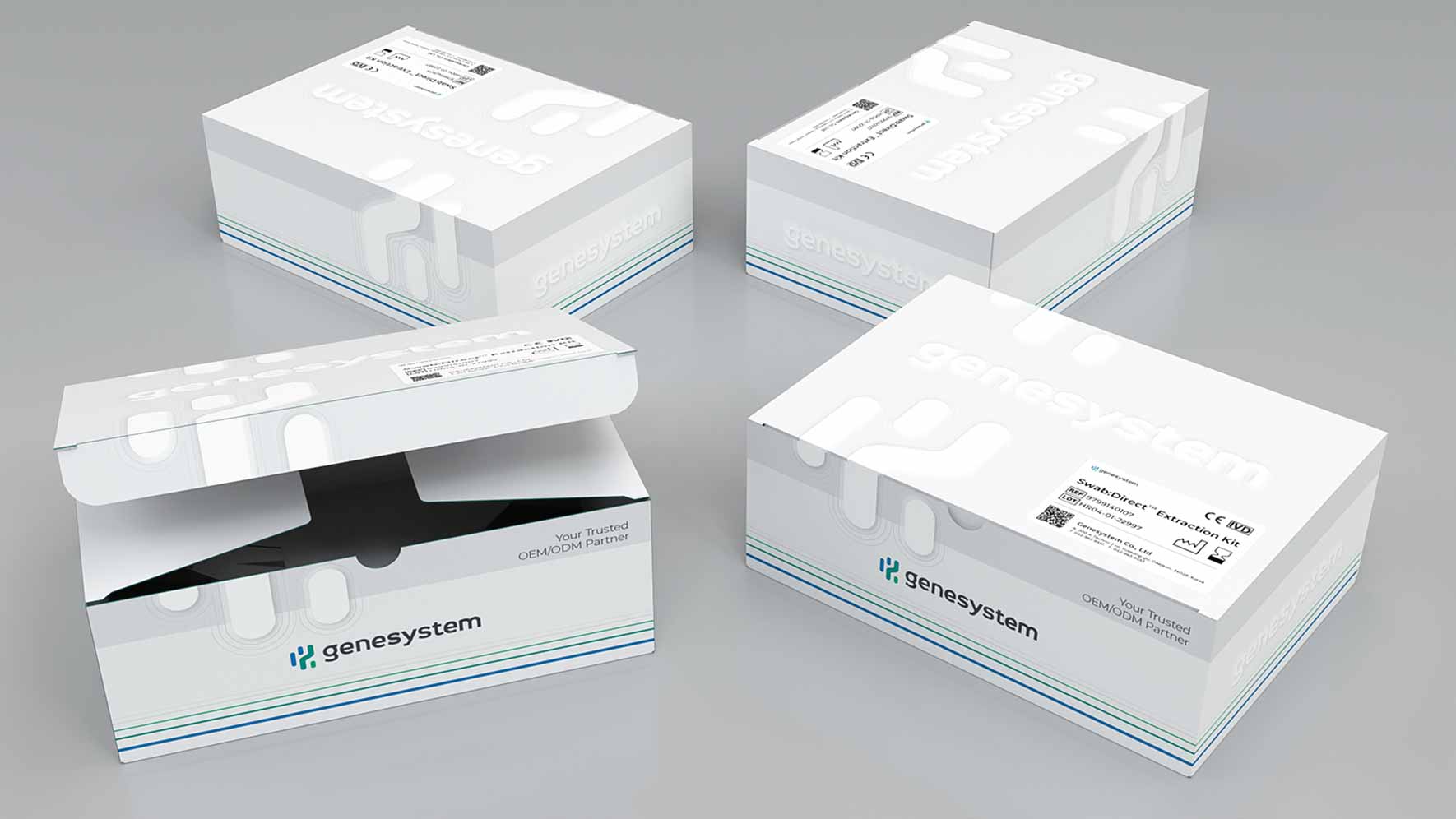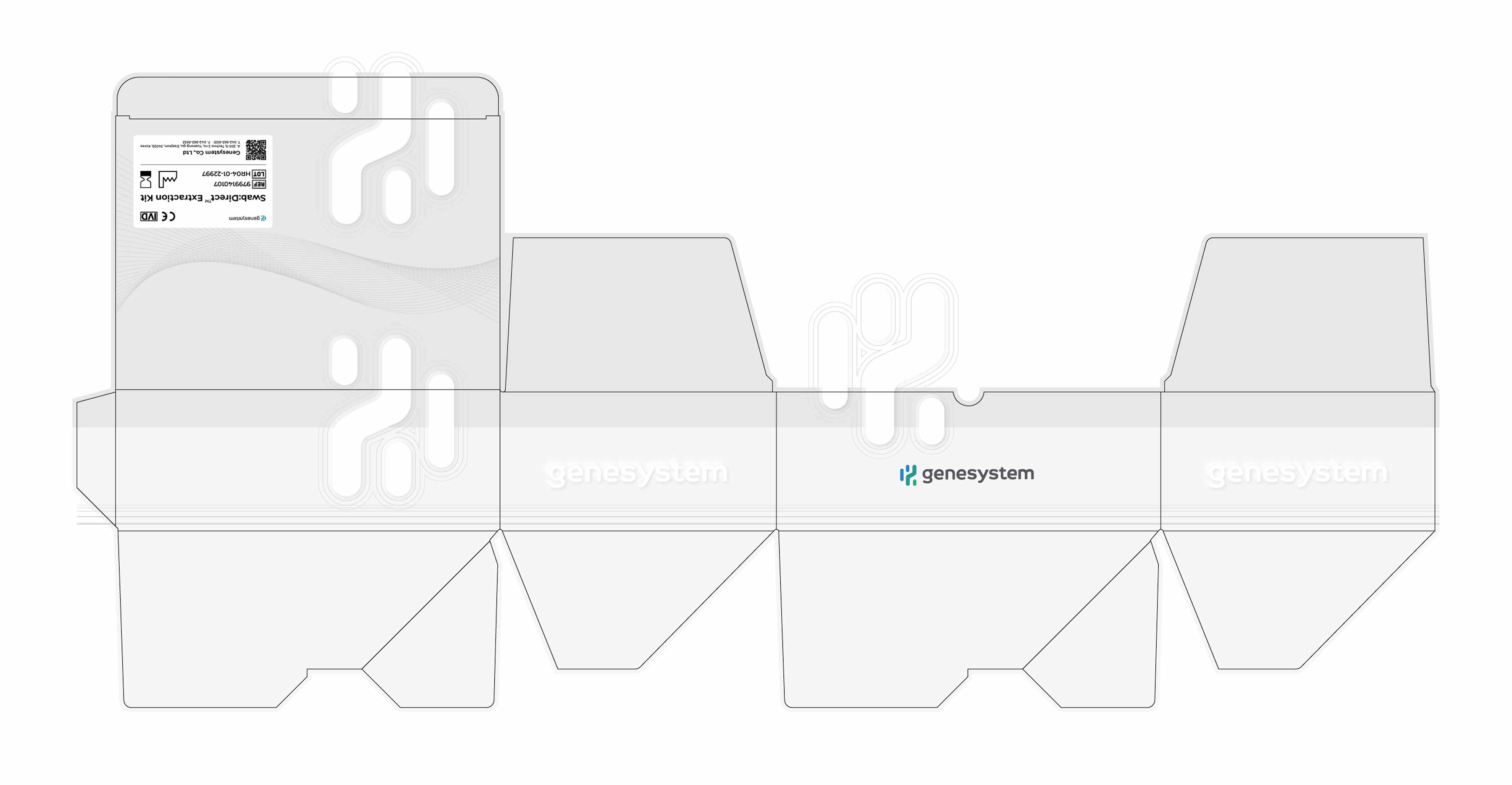 디자인 핵심 요소로 데이터와 유전자를 형상화한 진시스템의 심볼을 재구성하여 역동적인 흐름과 첨단 바이오 기술력을 표현합니다. 청결함과 전문성을 상징하는 흰색 지면에 브랜드 컬러인 테크니컬 그린과 딥 블루를 포인트 색상으로 활용했습니다. 특히 하프톤 패턴(Halftone Pattern)과 그라디언트를 활용하여 진단 과정의 정밀함을 드러내고자 하였습니다. 박스 덮개의 라벨링 구역은 실험실에서의 가독성을 우선하여 우측 하단에 배치했습니다. 제품명, 인증 마크(CE/ISO), QR 코드 등 필수 정보가 직관적으로 인식되도록 하였습니다.