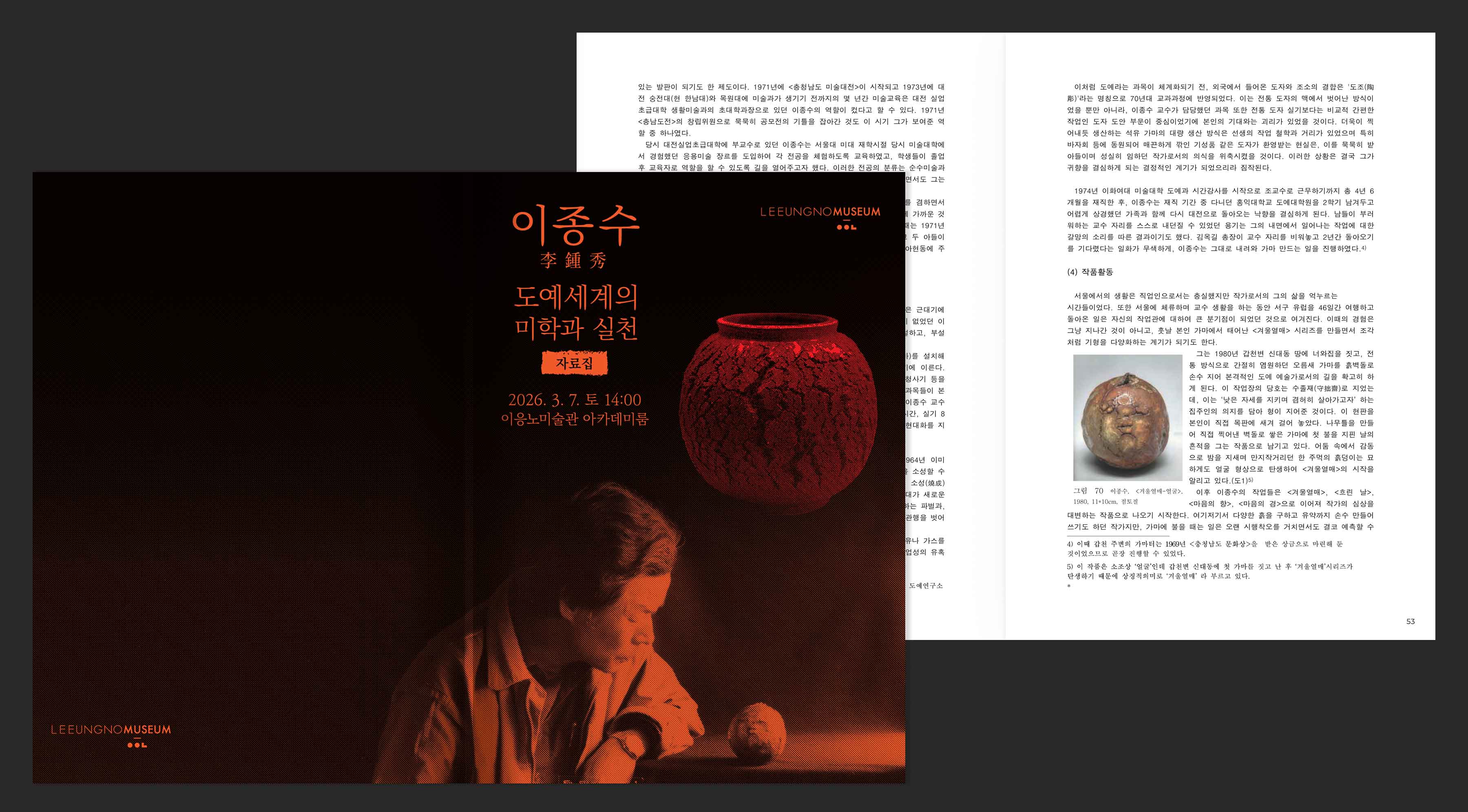심포지엄에 필요한 포스터, 자료집, 현수막을 디자인하였습니다. 키비주얼을 만들어 내기 위해서 먼저 도예가 이종수 선생님에 대한 이해가 필요했습니다. 다행이 유튜브에 관련 다큐멘터리와 인터뷰 영상 자료가 남아있었습니다. 더불어 메인 전시인 <>의 비주얼 아이덴티티도 연관된 맥락을 위해 참고하였습니다. 이종수 선생님의 도예세계를 하나의 컨셉 안에 담을 수는 없겠지만, 토기의 재료인 흙의 질감을 텍스쳐로 표현하고, 되도록 진솔하고 담담하게 표현하고자 했습니다.