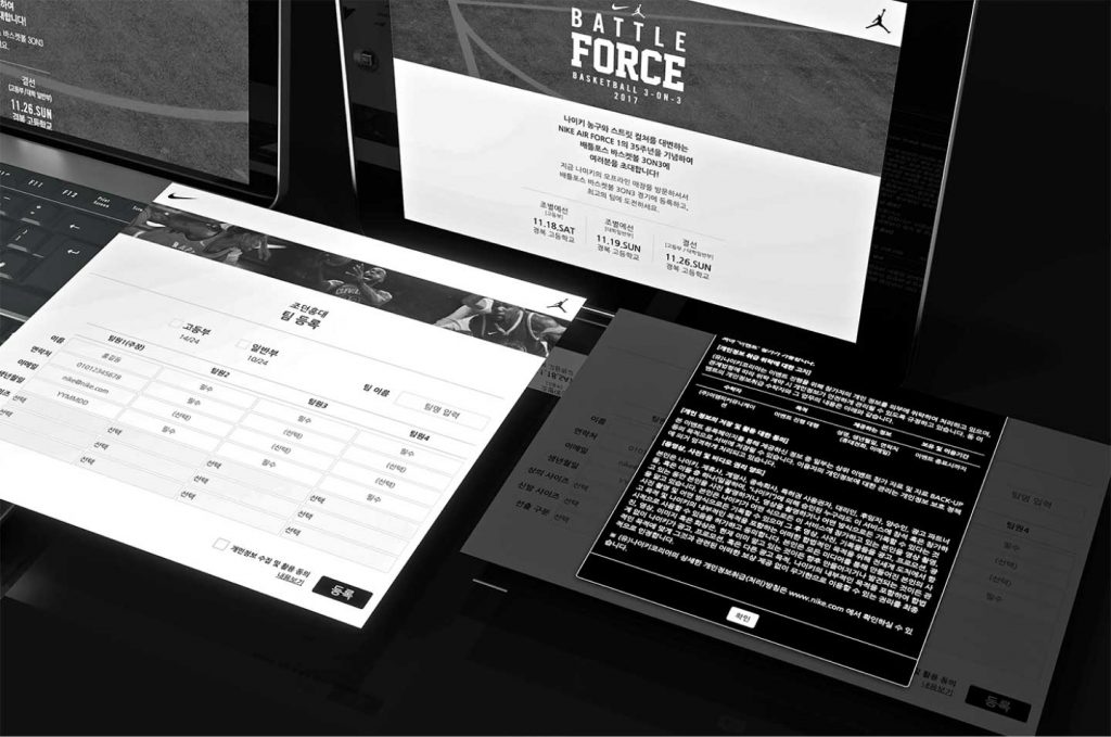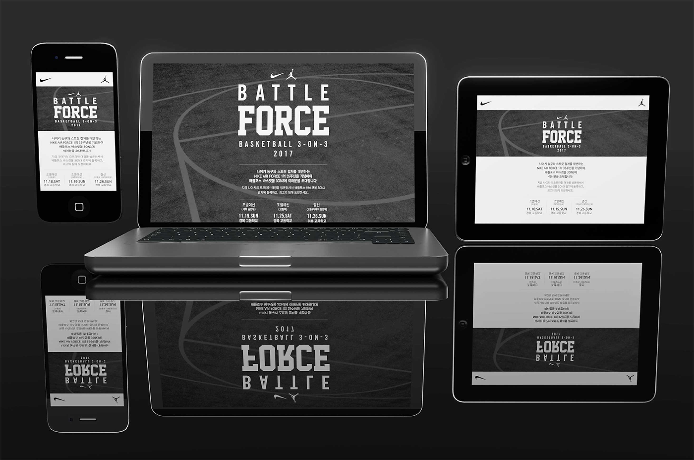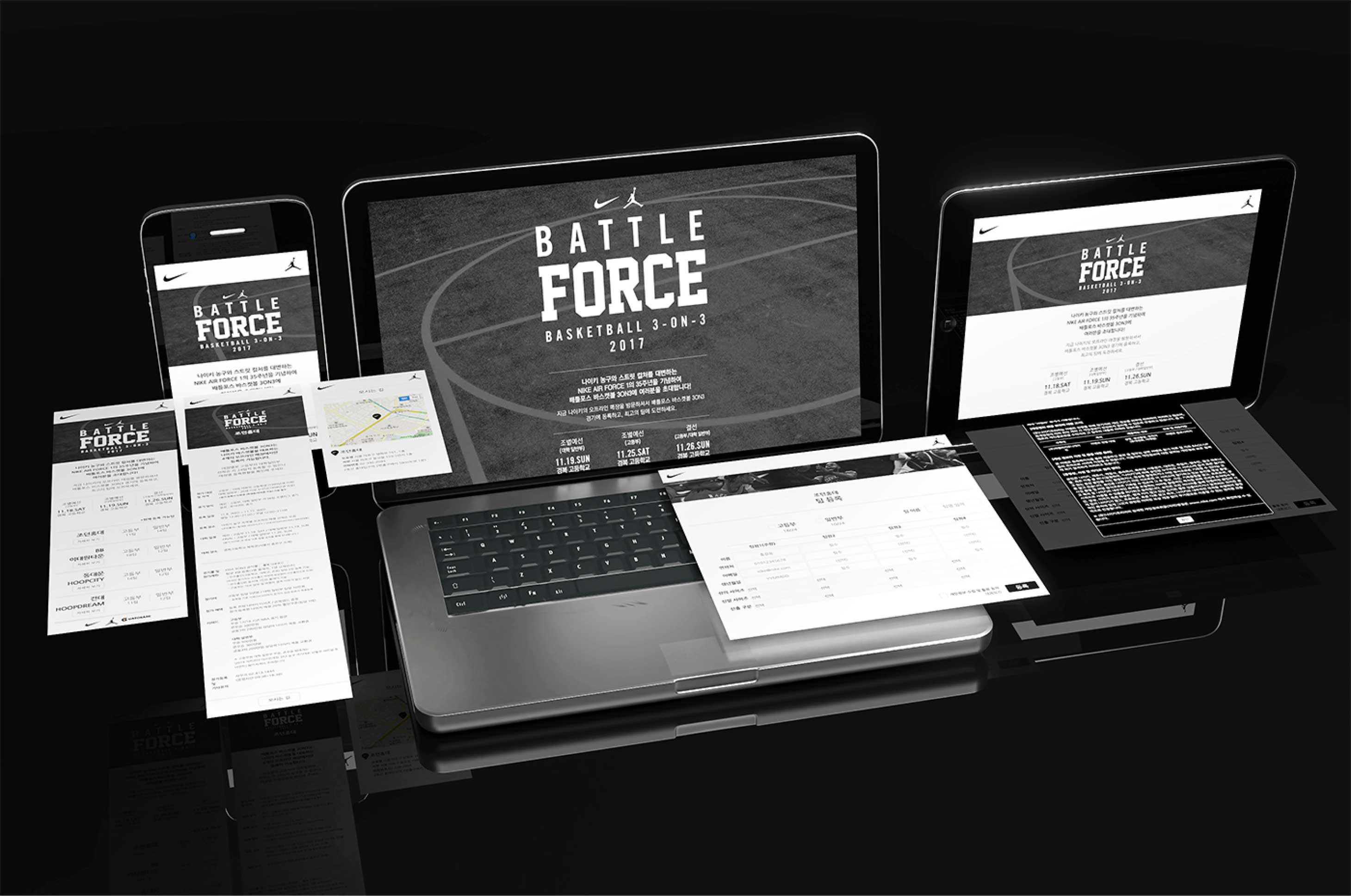 “나이키는 AIR FORCE 1의 35주년을 기념하여 배틀포스 바스켓볼 3 ON 3을 개최한다. 서울 주요 나이키 오프라인 매장인 홍대, 이태원, 동대문, 건대의 4개 매장에서 직접 선수들을 모집한다. 웹사이트는 3가지 플랫폼에서 작동하는데, 매장에서 아이패드로 선수 등록을 하고, 스마트폰으로는 지원 및 일정 상황을 파악한다. 데스크탑에서는 등록 선수를 관리한다.”